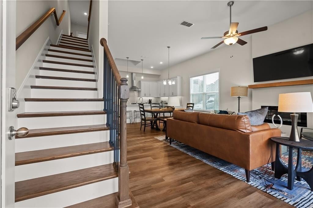 Stunning Home with an inviting,OPEN-CONCEPT layout. Prepare to be captivated by the exceptional TOWNHOUSE. Step into a realm of sophistication curated by designers. The HEART of this home at the 1st floor (Walkin level),the kitchen,is a culinary haven featuring 42" cabinets,adorned with exquisite QUARTZ countertops. It's a space where culinary dreams come to life,a testament to both style and functionality. As you enter the family room,be greeted by the warmth of a cozy ELECTRIC FIREPLACE,elegantly framed with SHIPLAP stretching to the ceiling. This space is more than just a room; it's an invitation to unwind,to create memories,and to truly experience the comforts of home. The LARGE SLIDER DOOR of the 11ft ceilings in the family room open to a beautiful OUTDOOR PATIO with a COVERED PORCH great for entertaining or enjoying your morning coffee. Upstairs,you’ll find a versatile loft space you can transform to fit your needs. The owner’s suite showcases an oversized shower and expansive WALK-IN-CLOSET DESIGNED by Space Makers. Two additional secondary bedrooms with an additional bathroom. However,what truly sets this home apart is not just its luxurious interior but also its exceptional LOCATION. Nestled within the SECURE GATES of an amenity-rich community,you'll have the world of convenience and leisure right at your doorstep. Welcome to a neighborhood where elegance meets comfort,where luxury becomes an everyday affair. Not only will you enjoy the stunning features of this new home,but the community is also gated and beautifully maintained at a convenient location: ** Within ~10 minutes from Costco,Walmart,Target,Sam's Club,and several restaurants in Downtown Woodstock ** Within ~15 minutes of KSU Village at Towne Lake offers a range of excellent amenities to enjoy such as: ** A LARGE luxury CLUBHOUSE ** community fitness center / GYM ** POOL,PICKLEBALL COURT,bocce ball,FIRE PITS ** Multiple DOG parks *Some Pictures of the model home is also added to show the full potential and for illustrative purposes only.