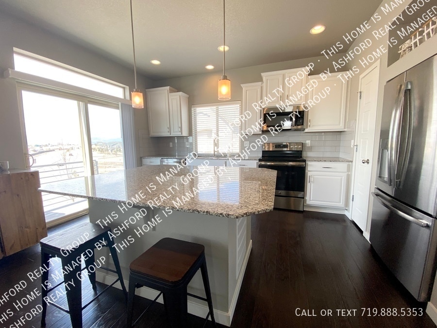 Beautiful home in popular Banning Lewis Ranch. Immaculately maintained with many upgrades. No homes behind you gives you amazing unobstructed mountain views! Spacious, open kitchen and living room that feature beautiful wood floors, white cabinets, a large granite island and stainless appliances. Large master bedroom is on the main level and includes a 5 piece bath. Upstairs you will find two other spacious bedrooms and a full bath. The lower level includes a large family room or play area. Banning Lewis offers many pocket parks and trails, two recreation centers and pools, a dog park and pickle courts!! Banning Lewis Ranch offers a K-5 and a 6-12 charter school!! A PROSPECTIVE TENANT HAS THE RIGHT TO PROVIDE TO THE LANDLORD A PORTABLE TENANT SCREENING REPORT, AS DEFINED IN SECTION 38-12-902(2.5), COLORADO REVISED STATUTES; ANDIF A PROSPECTIVE TENANT PROVIDES THE LANDLORD WITH A PORTABLE TENANT SCREENING REPORT, THE LANDLORD IS PROHIBITED FROM: CHARGING THE PROSPECTIVE TENANT A RENTAL APPLICATION FEE; OR CHARGING THE PROSPECTIVE TENANT A FEE FOR THE LANDLORD TO ACCESS OR USE THE PORTABLE TENANT SCREENING REPORT. Disposal Fence Garage Range Views