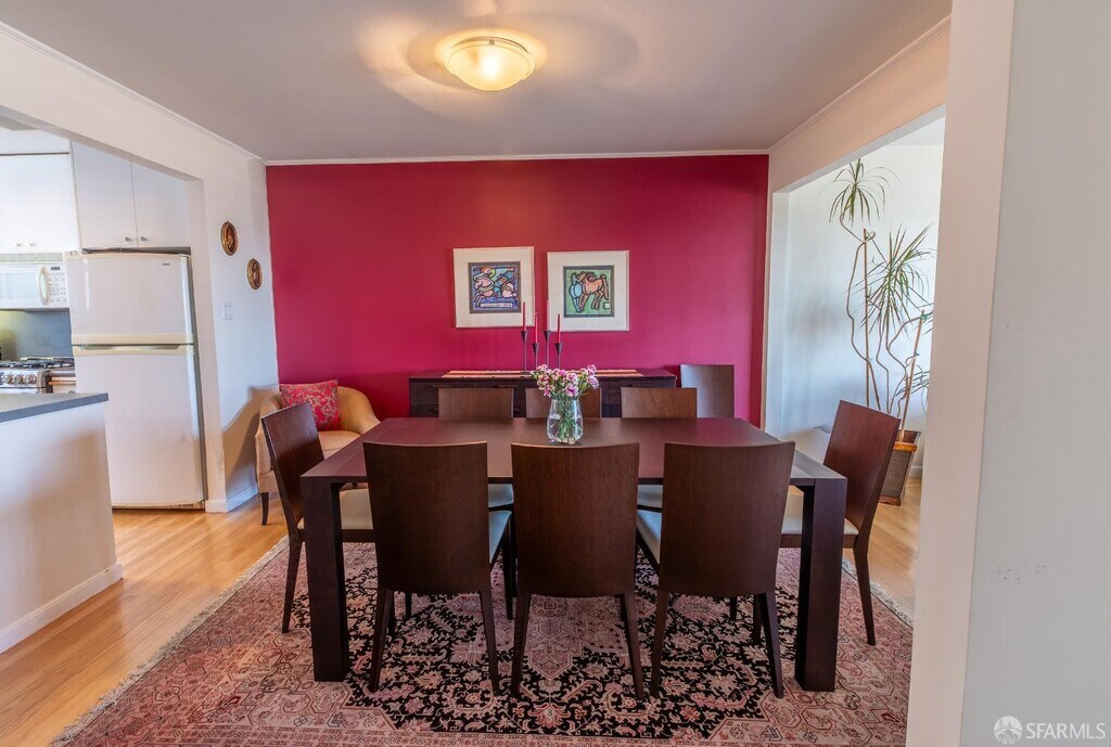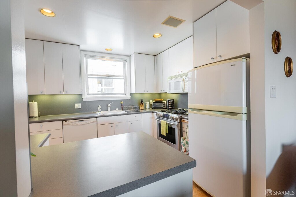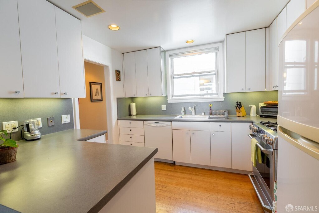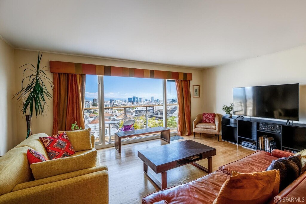 Beautiful and spacious, this mid-century one-bedroom, one-bath condominium is one of only four units in a quiet, well-maintained Anza Vista building. Enjoy spectacular panoramic downtown and city skyline views not only from the open living and dining area but also from the bright, open kitchen and even the bathroom. The living space flows seamlessly onto a private deckthe perfect spot to take in colorful sunrises, golden-hour light, or San Francisco's sparkling nighttime skyline. The home features gleaming hardwood floors, two generous walk-in closets, and an updated kitchen with quartz countertops, stainless steel gas range, dishwasher, and full-size refrigerator. The bathroom includes a classic cast-iron tub and shower combination, ideal for relaxing after a long day. Additional highlights include a private garage with deeded parking, easy street parking, bicycle storage, and a shared landscaped backyard garden. Ideally located near USF, Kaiser Permanente, Golden Gate Park, Laurel Village, NOPA, Trader Joe's, Target, and public transportation, this pristine residence at 64 Encanto Avenue is offered fully furnished on a one-year leasecombining comfort, convenience, and iconic San Francisco views in one truly special home.