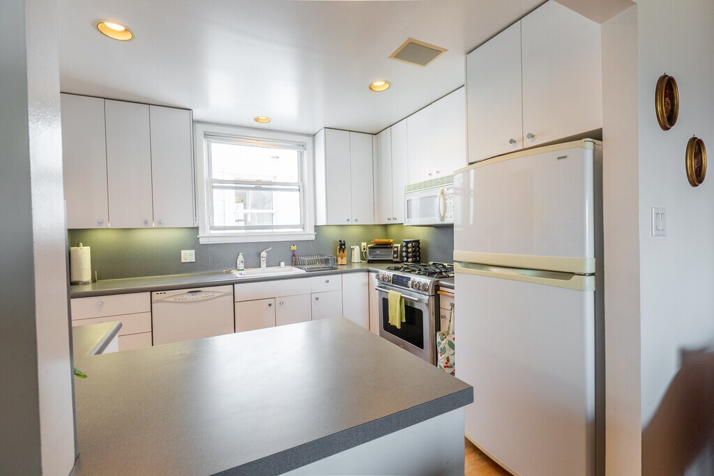 Beautiful and spacious, this mid-century one-bedroom, one-bath condominium is one of only four units in a quiet, well-maintained Anza Vista building. Enjoy spectacular panoramic downtown and city skyline views not only from the open living and dining area but also from the bright, open kitchen and even the bathroom. The living space flows seamlessly onto a private deck—the perfect spot to take in colorful sunrises, golden-hour light, or San Francisco’s sparkling nighttime skyline. The home features gleaming hardwood floors, two generous walk-in closets, and an updated kitchen with quartz countertops, stainless steel gas range, dishwasher, and full-size refrigerator. The bathroom includes a classic cast-iron tub and shower combination, ideal for relaxing after a long day. Additional highlights include a private garage with deeded parking, easy street parking, bicycle storage, and a shared landscaped backyard garden. Ideally located near USF, Kaiser Permanente, Golden Gate Park, Laurel Village, NOPA, Trader Joe’s, Target, and public transportation, this pristine residence at 64 Encanto Avenue is offered fully furnished on a one-year lease—combining comfort, convenience, and iconic San Francisco views in one truly special home.