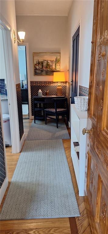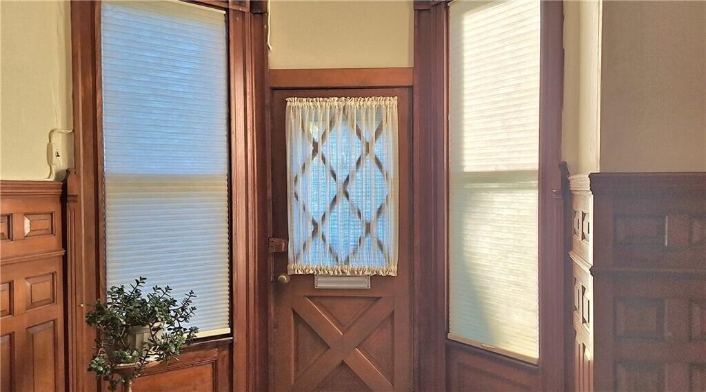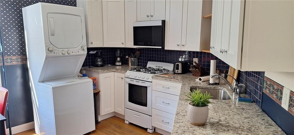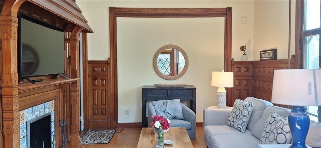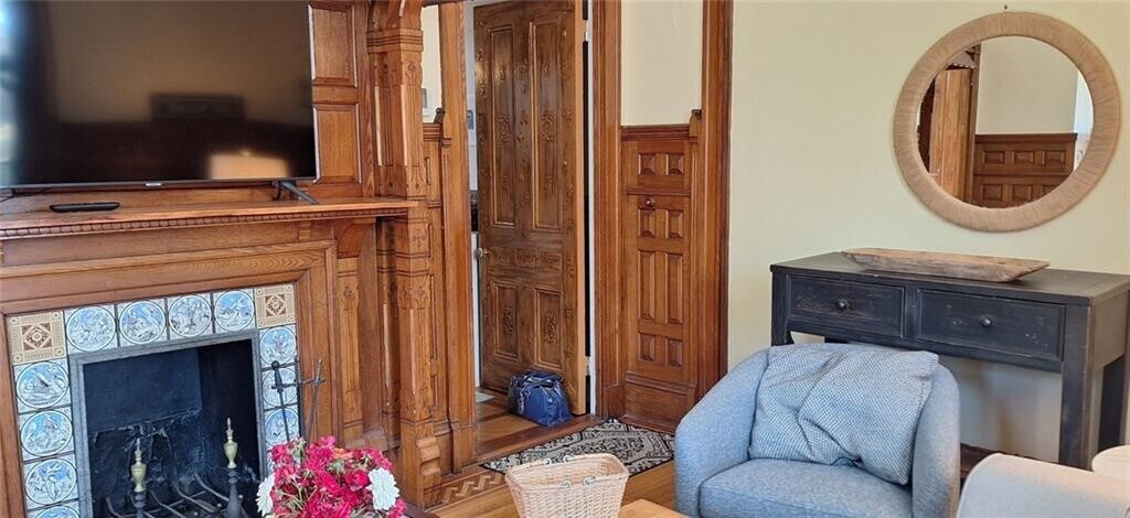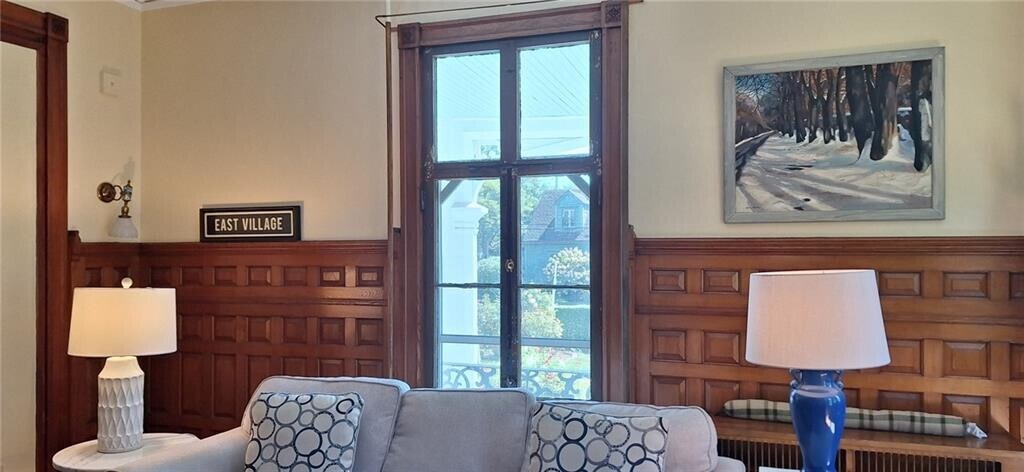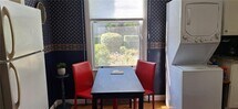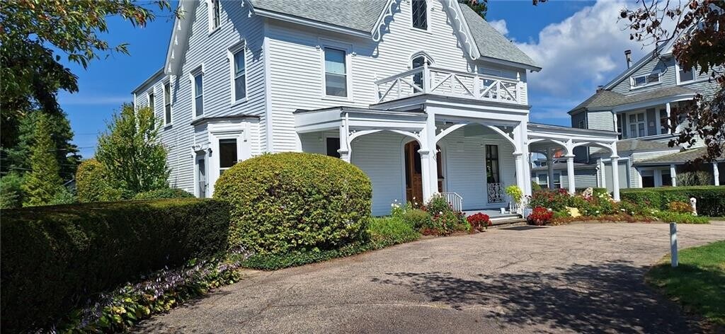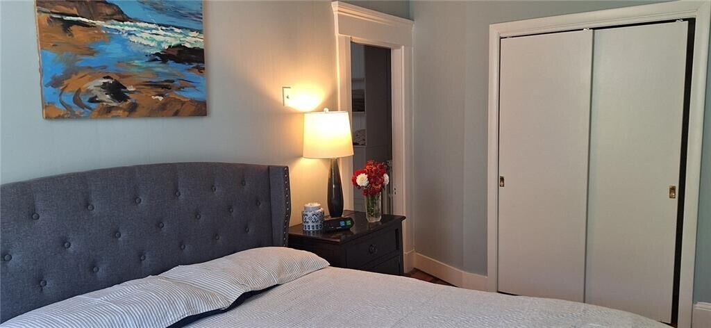 Available now,the architectural detailing in this sunny quiet 1 bedroom corner first floor apartment rarely comes on the rental market. Perfect for the downsizing individual. An original gothic revival "summer cottage" was occupied around the 1860's by famous American author Henry James. A private side entry leads into an elegant living room with tall period-style windows,an ornamental fireplace,carved light oak panelled walls and parquet floors - middle eastern A-List style. A passageway leads past the kitchen into the bedroom and then onto the bathroom. There is a back entrance hall and a great storage space/mud-room/ 3-season sunroom. The eat-in-kitchen has all the appliances including a stacking washer/dryer. Sunlight and views onto the formal side garden. A mantle and tiled hearth complement the parquet flooring. At the end of the hallway is a cozy writing desk nook. The bedroom is comfortably sized with a sunny window,hardwoods and a deep closet. Extra storage outside the bathroom in the hallway provides plenty of additional shelving. Mosaic tiling in the all-white-and-black bathroom,with a shower stall,gives the impression of spaciousness. Furn. or unfurn. Tenant pays gas for stove and heat and hot water; electricity; and cable. Water,garbage removal,snow removal is included. The owner occupant maintains the beautiful flower beds and yard. Quiet people. References required. No smoking/vaping/pets. Lead present in exterior paint. Multi year lease preferred.