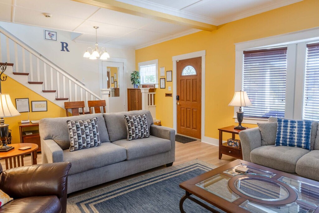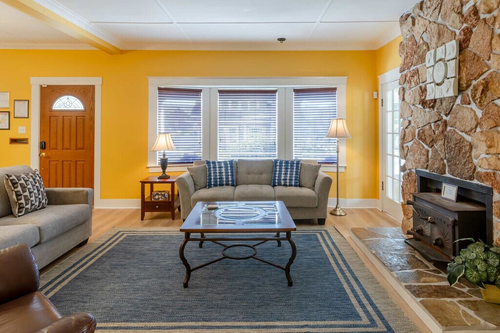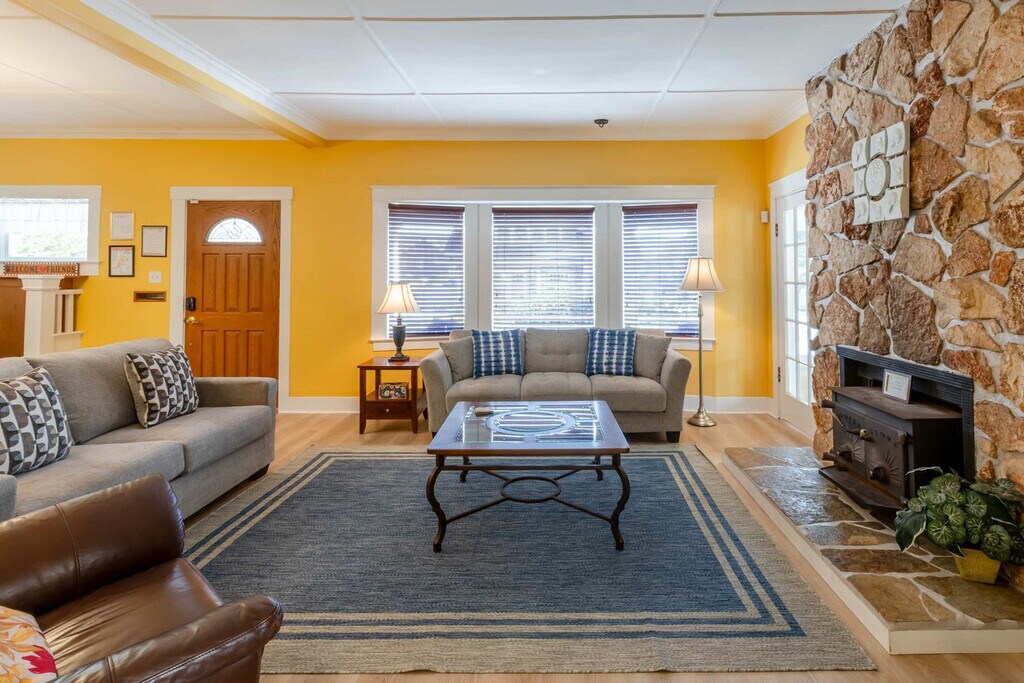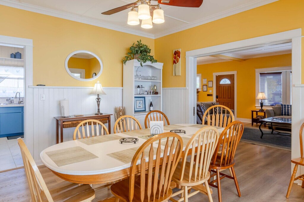 Feel at home in this spacious 5-bedroom, 3-bath home in Seaside, just two streets from the beach. This home sleeps 14 and blends vintage Seaside charm with lots of room to unwind. This beach house is full of character and vintage charm. The game room includes an air hockey table, foosball table, poker table complete with chips for up to 8 players, cozy couch, board games, puzzles, and cards. The fully equipped kitchen features a full-size fridge, oven, cooktop, microwave, toaster, air fryer, blender, slow cooker, Keurig, drip coffee maker, electric kettle, dishes, silverware, mugs, wine glasses, pots, pans, utensils, baking sheets, muffin tins, loaf pans, a spice cabinet, and cooking oils. Other amenities include a 55” Smart TV, a shared washer and dryer, complimentary unscented laundry pods, a Pack 'n Play with padded mattress and sheets, a baby bath, a changing table, a high chair, kid-friendly plastic dinnerware, shampoo, conditioner, body wash, hand soap, Q-tips, cotton pads, dental picks, plush towels and linens, beach towels, a hair dryer, and a first-aid kit. Step outside and have your toes in the sand within minutes, or rent a surrey and cruise the Seaside Prom. Walk to coffee shops, breakfast spots, restaurants, and local boutiques all just blocks away. The front porch is perfect for morning coffee, evening chats, or just people-watching. Gather around the backyard firepit with six chairs for s’mores, stories, or just some starry-night relaxation. Please respect quiet hours from 10 pm-8 am both inside and outside. Smoking inside the home is prohibited, and any smoking evidence will result in a fee for odor removal, duct cleaning, and furniture cleaning. Parties and events are not allowed. Includes a dedicated workspace desk and high-speed Wi-Fi. [SI]