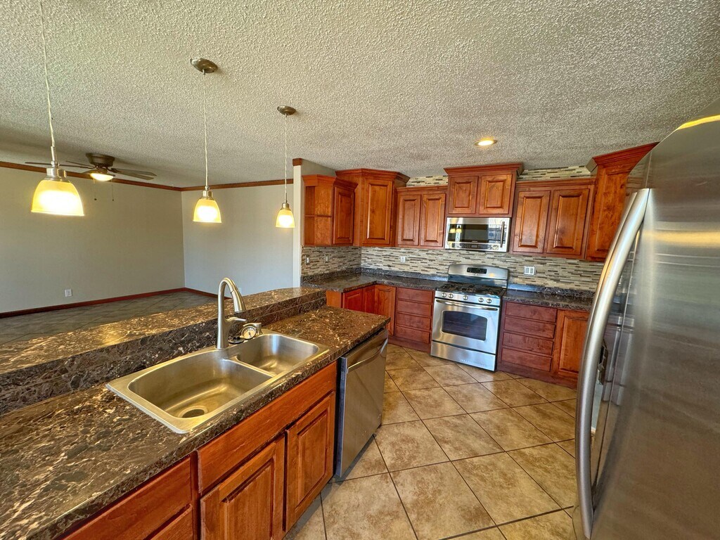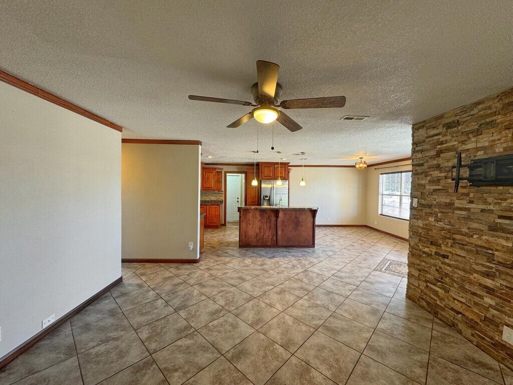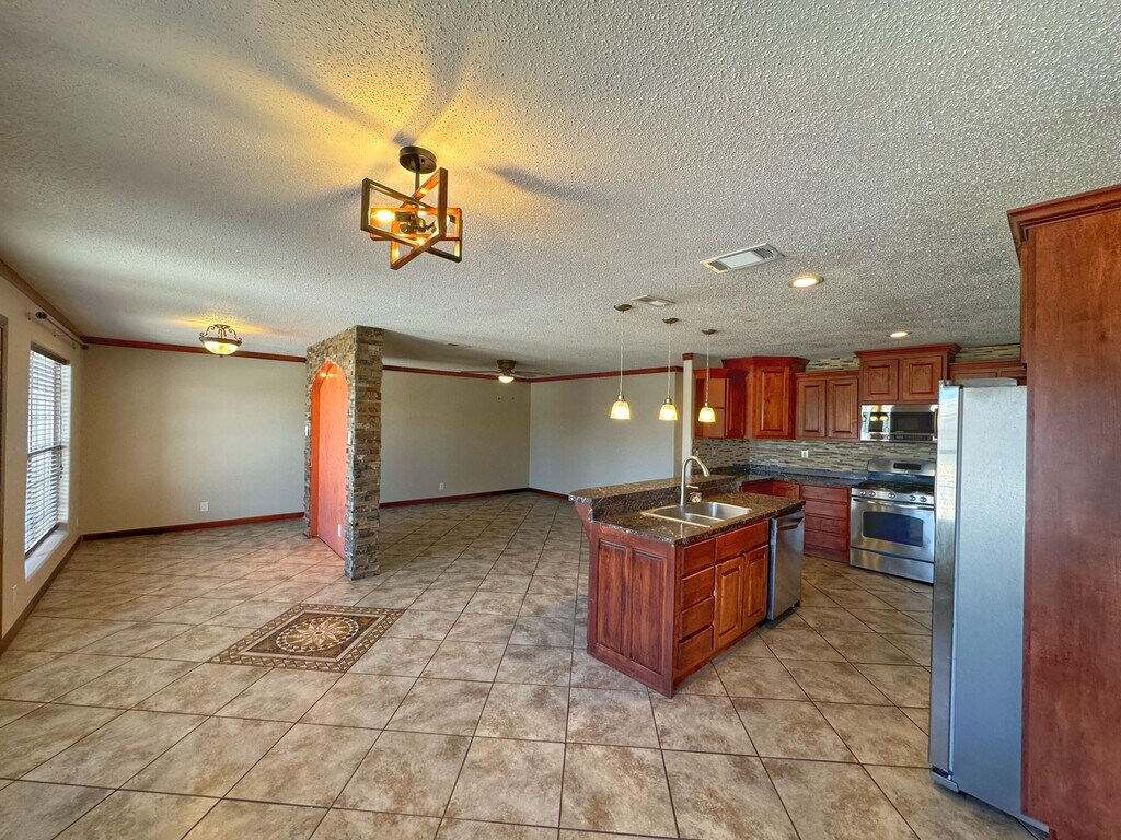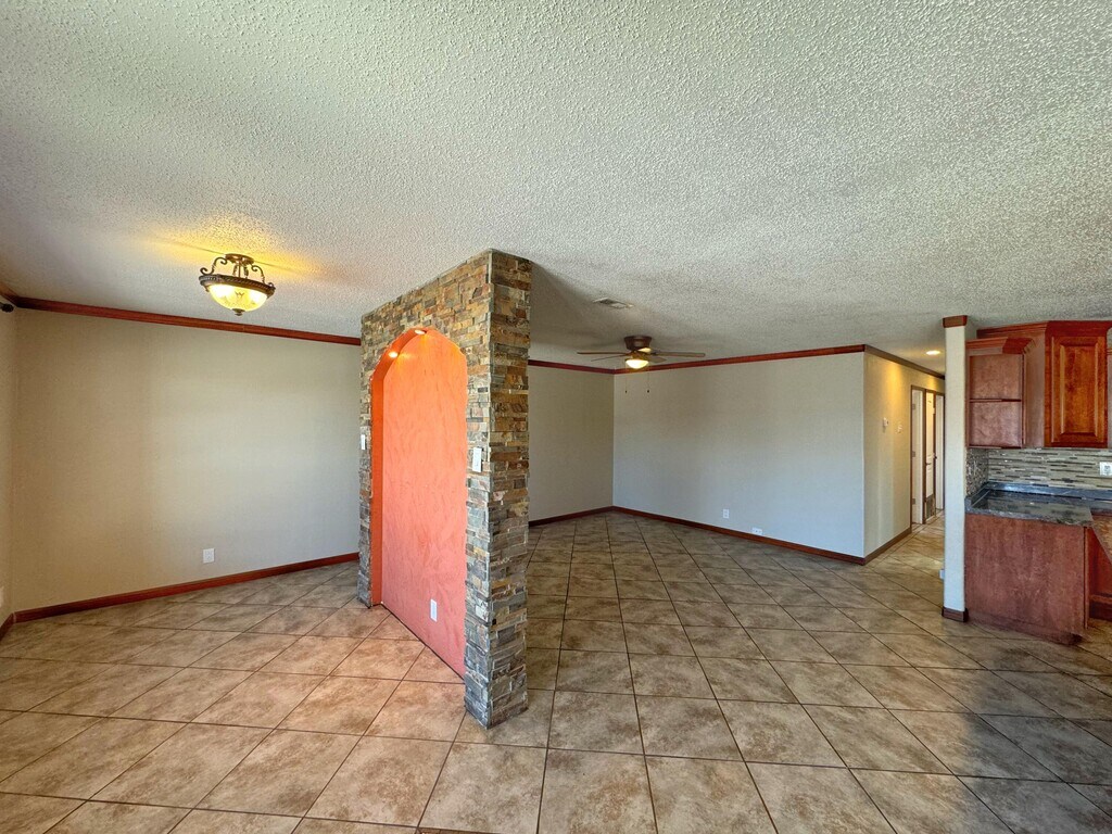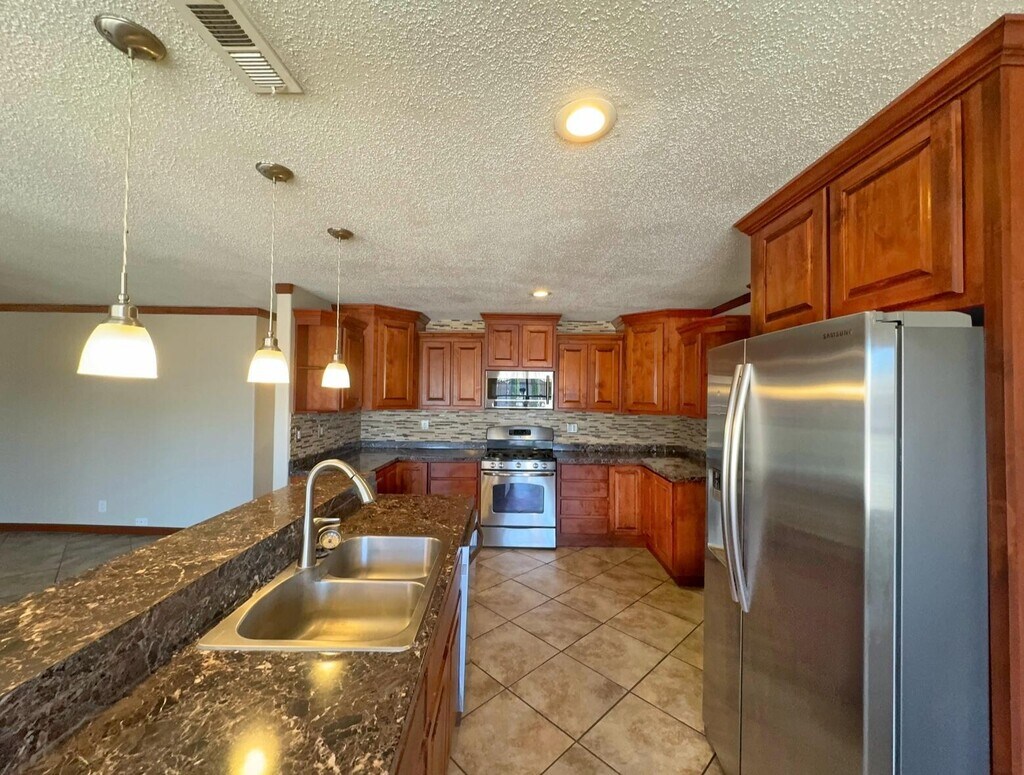 Gorgeous Kitchen with ample cabinetry space and stone looking counter tops. Rock Wall accent separates the great room. Laminate and tile floors throughout this home. Three bedrooms,laundry room,big yard. Easy access to I-40,schools,shopping and community center.