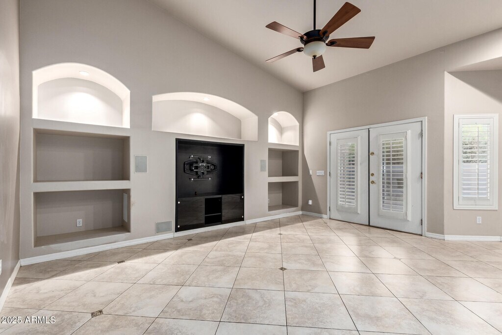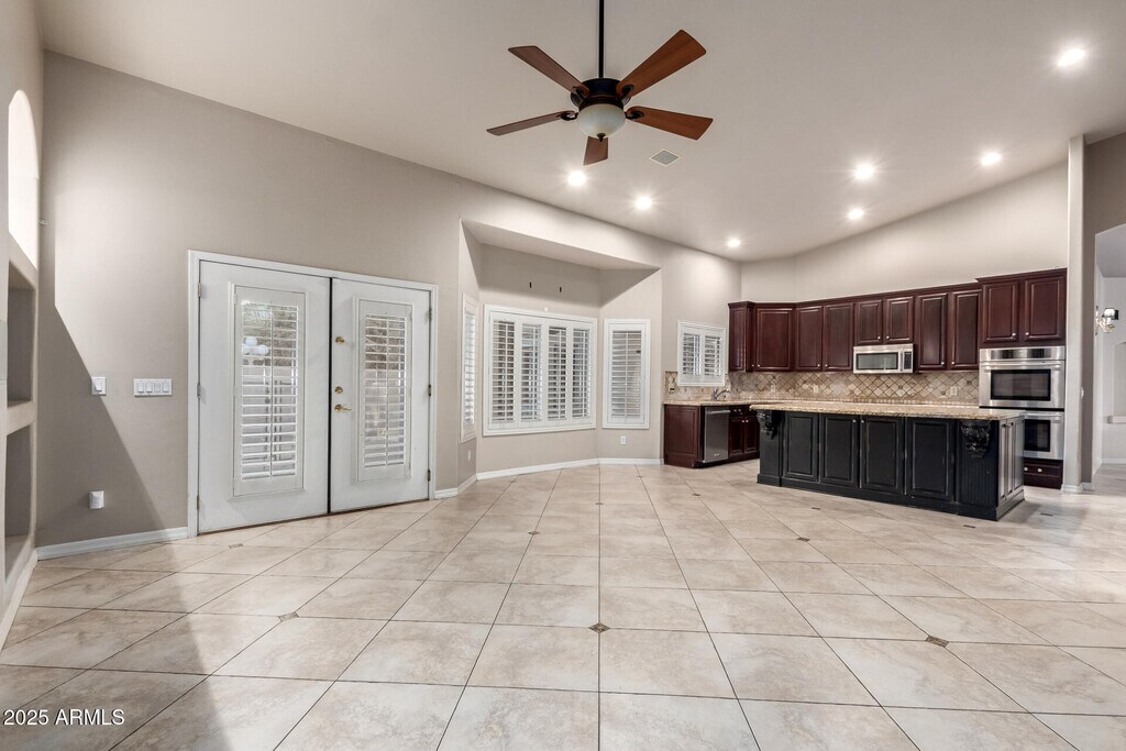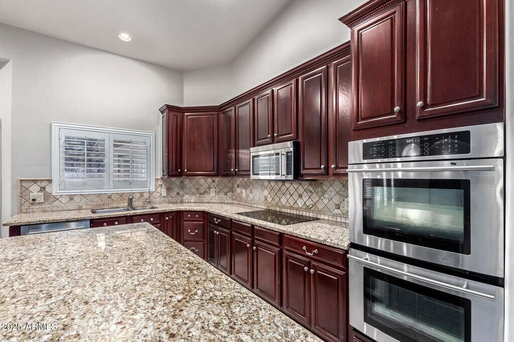 Exquisite rental alert! This beauty greets you with eye-catching stone accents and a roomy 2-car garage. Inside,you'll find soaring vaulted ceilings,elegant plantation shutters,and wood-look floors that set the perfect tone. Host your favorite gatherings in the formal dining area,or unwind in the great room featuring wall niches and pre-wired surround sound,making movie nights just got better! The kitchen is a chef's delight with stainless steel appliances,granite counters,tile backsplash,wall ovens,and a spacious island with a breakfast bar. The primary retreat offers a bay window,private bath,and a walk-in closet,which is pure comfort! Need extra space? The bonus room with mirrored walls is ideal for a home gym or media hub... while another bedroom with built-ins makes a great office. Outside,the fun continues with a covered patio,built-in BBQ,firepit,and a sparkling fenced pool surrounded by lush greenery. Whether you're relaxing under the sun or stargazing at night,this one has it all! Don't miss out!