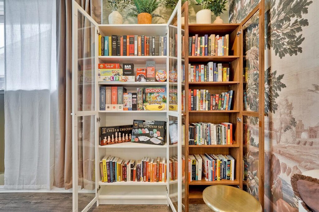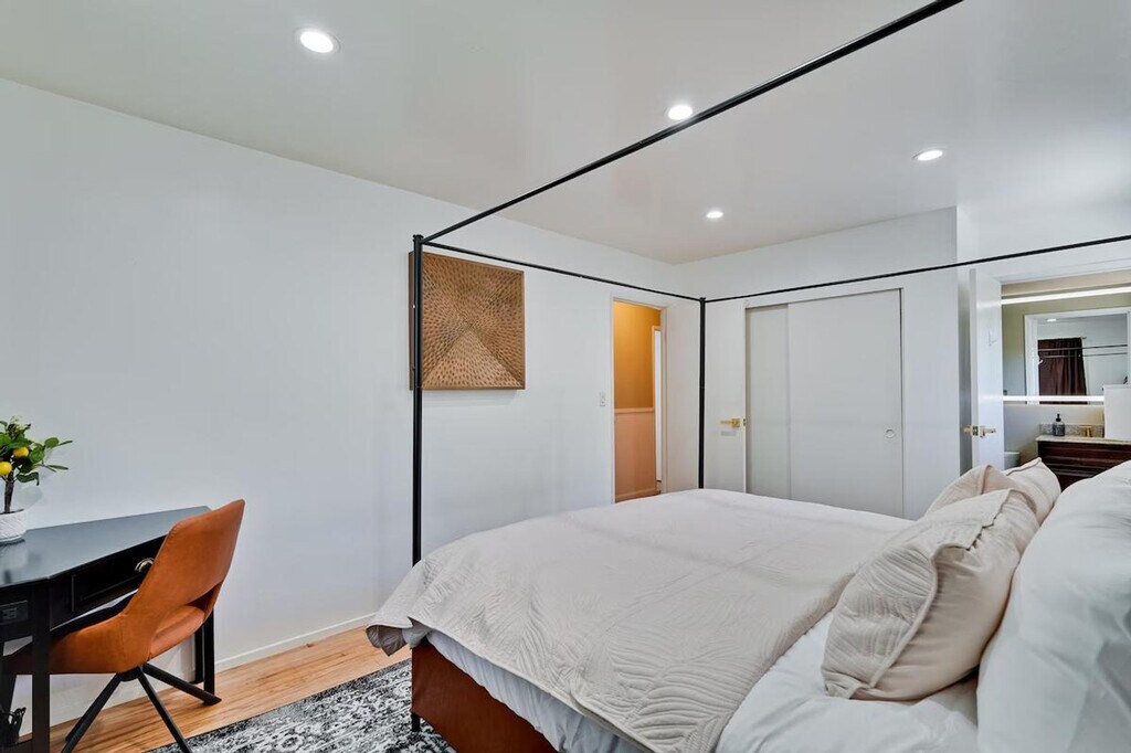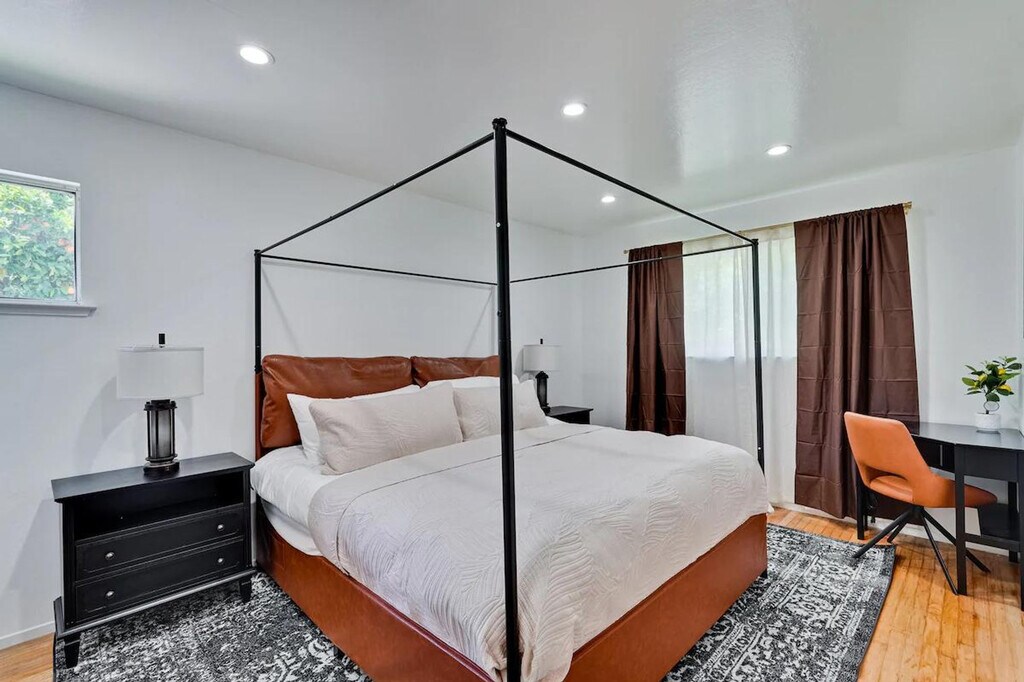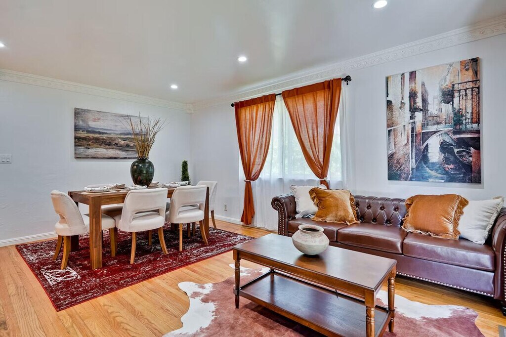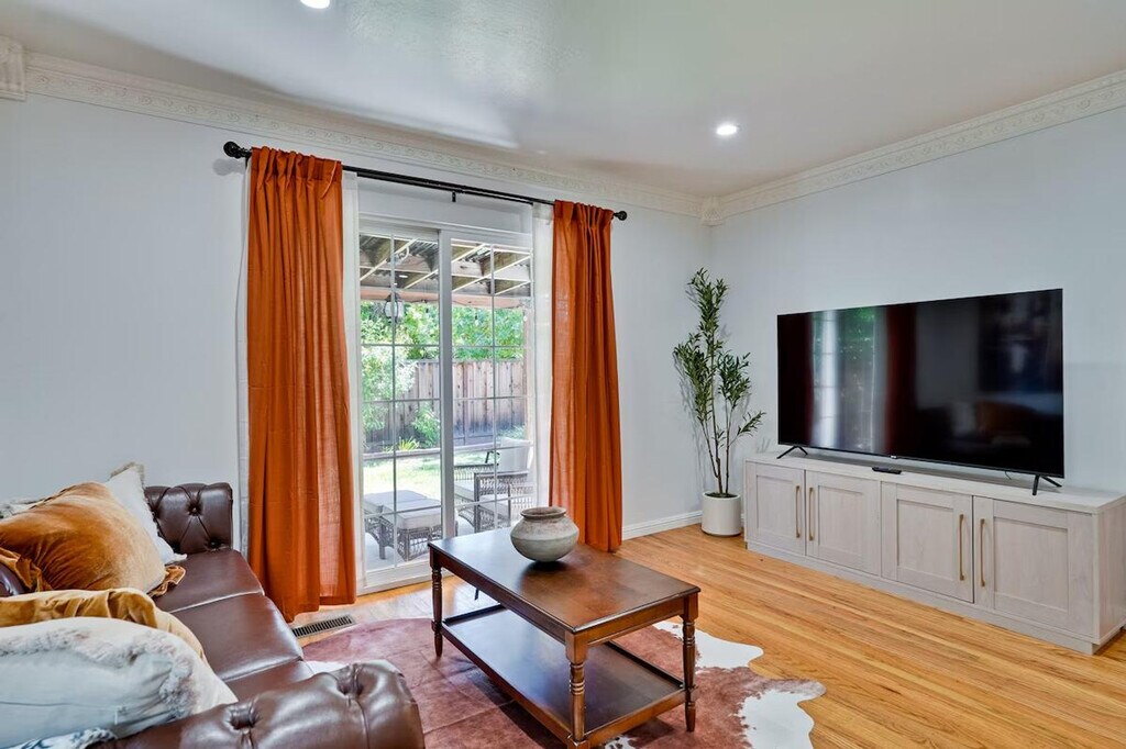 Step into style and comfort at this 4-bedroom retreat in Almaden, San Jose. The heart of the home is a thoughtfully curated library lounge designed with cozy seating, warm lighting, and a handpicked book collection, perfect for unwinding or quiet inspiration. Outside, a private backyard awaits with citrus trees including lemon and orange and serene seating. Great for families, friends, or creatives seeking calm and charm. Whether whipping up a quick breakfast or hosting a group dinner, the fully equipped kitchen has everything you need, including a rice cooker, water kettle, coffee maker, oven, microwave, oven toaster, and blender. The dining table seats 6 comfortably and the kitchen is stocked with cookware, utensils, and basic pantry staples. The Italian-inspired lounge blends old-world charm with functional elegance, featuring velvet armchairs, large bookshelves with handpicked titles, and warm lighting. The open-concept living room offers plush sectional seating, refined finishes, and a calming atmosphere perfect for conversation or reading. The property includes a utility room perfect for extended stays, featuring a washer and dryer with complimentary detergent provided. Nestled in Almaden’s serene neighborhood, this home is just a 5-minute drive from Costco, Safeway, Target, and top restaurants. Enjoy local cafes, family-run Italian spots, and casual eats, along with nearby gyms like City Sports Club and 24 Hour Fitness. This property is designed for serenity and socializing, with a backyard that serves as a private oasis featuring fruit trees like lemon, orange, and plum, a large lawn ideal for picnics, yoga, or family games, and an outdoor lounge with comfortable seating. Check-in and check-out times are flexible to accommodate your schedule. The library lounge offers a serene environment for work or relaxation, with cozy seating and warm ambient lighting, ideal for remote work.