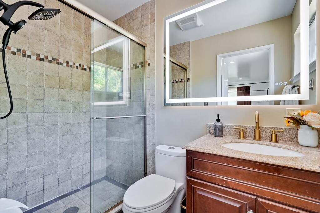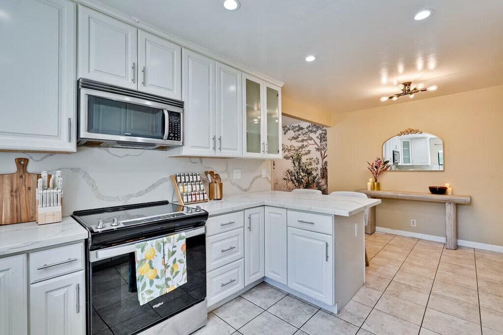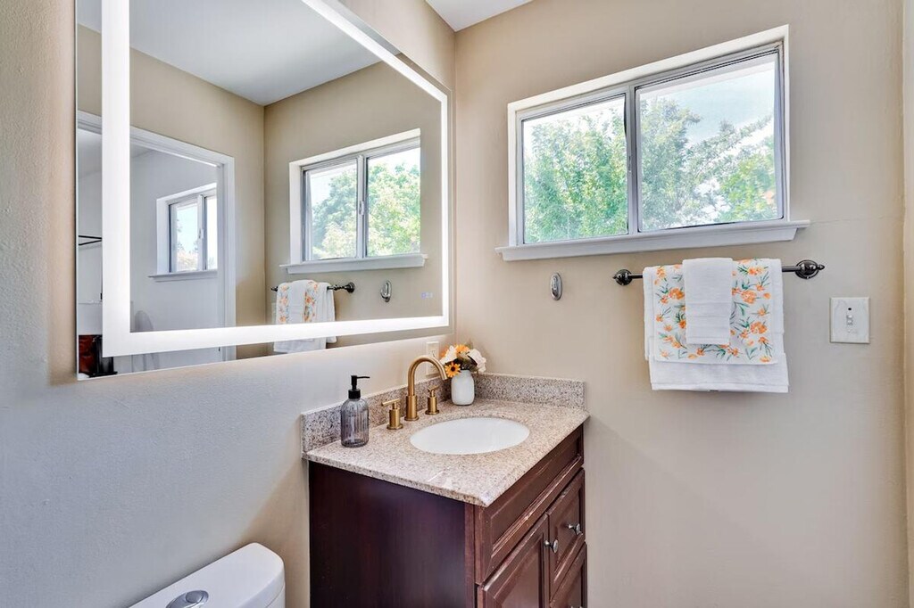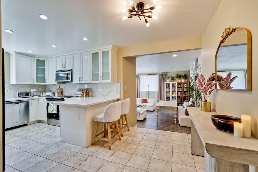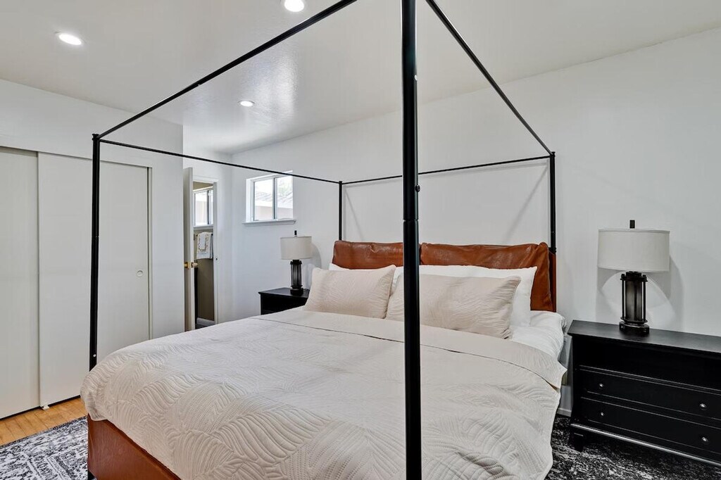 Step into style and comfort at this 4-bedroom retreat in Almaden, San Jose. The heart of the home is a thoughtfully curated library lounge designed with cozy seating, warm lighting, and a handpicked book collection, perfect for unwinding or quiet inspiration. Outside, a private backyard awaits with citrus trees including lemon and orange and serene seating. Great for families, friends, or creatives seeking calm and charm. Whether whipping up a quick breakfast or hosting a group dinner, the fully equipped kitchen has everything you need, including a rice cooker, water kettle, coffee maker, oven, microwave, oven toaster, and blender. The dining table seats 6 comfortably and the kitchen is stocked with cookware, utensils, and basic pantry staples. The Italian-inspired lounge blends old-world charm with functional elegance, featuring velvet armchairs, large bookshelves with handpicked titles, and warm lighting. The open-concept living room offers plush sectional seating, refined finishes, and a calming atmosphere perfect for conversation or reading. The property includes a utility room perfect for extended stays, featuring a washer and dryer with complimentary detergent provided. Nestled in Almaden’s serene neighborhood, this home is just a 5-minute drive from Costco, Safeway, Target, and top restaurants. Enjoy local cafes, family-run Italian spots, and casual eats, along with nearby gyms like City Sports Club and 24 Hour Fitness. This property is designed for serenity and socializing, with a backyard that serves as a private oasis featuring fruit trees like lemon, orange, and plum, a large lawn ideal for picnics, yoga, or family games, and an outdoor lounge with comfortable seating. Check-in and check-out times are flexible to accommodate your schedule. The library lounge offers a serene environment for work or relaxation, with cozy seating and warm ambient lighting, ideal for remote work.