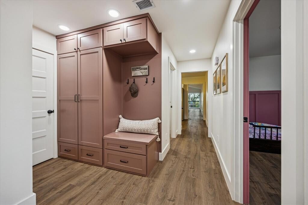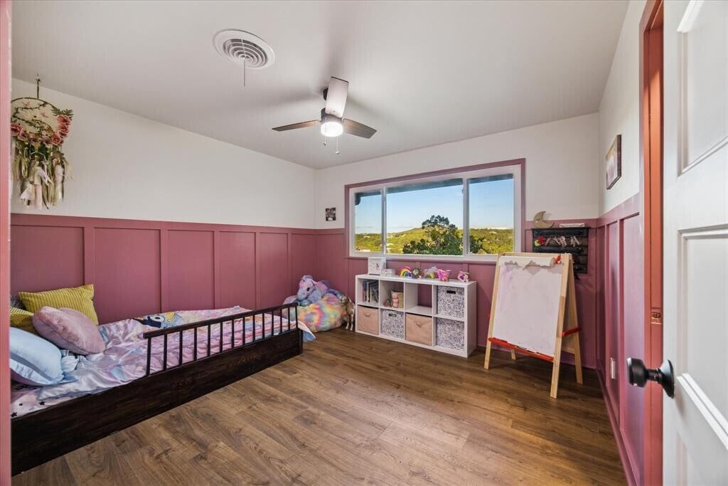 This restored mid-century bungalow sits on a premium oversized corner lot just two blocks from the lake and marina, and only minutes from schools and 1431. Thoughtfully updated while preserving its 1959 charm, this 4-bedroom, 3-bathroom home offers 2,415 sq ft of light-filled living with panoramic Hill Country views that stretch for miles. The main level welcomes you with an inviting open-concept living and dining space, anchored by a stunning rose-quartz stone fireplace and framed by vaulted ceilings and expansive picture windows overlooking the hills. The stonework extends across the living area, creating an organic, grounded feel enhanced by warm-toned luxury plank flooring throughout. The kitchen features stainless steel appliances (with optional dual-ice refrigerator), ample cabinetry, and a charming garden window—perfect for your favorite plants. All three upstairs bedrooms offer sweeping views, while the primary suite includes a private bath with shower/tub combo. The recently renovated guest bath showcases a deep-soaking tub, floor-to-ceiling designer tile, quartz countertops, and a custom double vanity. A custom built-in mudroom with cabinetry, bench seating, and thoughtful storage maximizes function and design. The laundry room includes additional cabinetry, shelving, and a pull-down ironing board, with optional washer and dryer included. Downstairs, a flexible second living area with large picture windows can serve as a game room, art studio, or guest retreat, complete with a private bedroom with walk-in closet and full bath nearby. Outside, a gorgeous front porch and back deck offer space for relaxation, with a two-car garage and expansive driveway providing plenty of parking. Residents enjoy access to Lago Vista POA amenities, including multiple waterfront parks, boat ramps, optional pool/gym, and more—all in a peaceful, lakeside setting. Experience timeless design, modern comfort, and Hill Country tranquility all in a beautifully updated nature space.