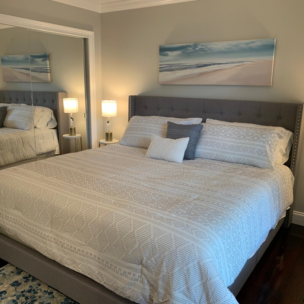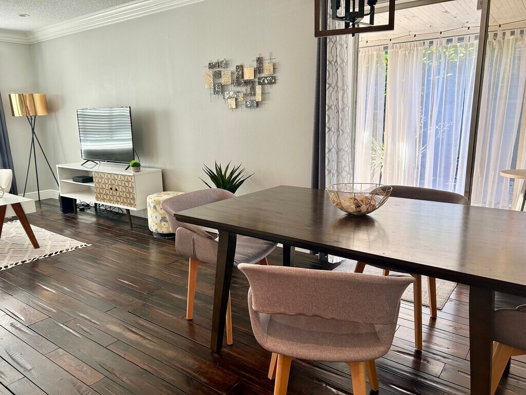 Gorgeous Newer Furnishings in the beautiful 2 bedroom ( 2nd bedroom is Office) 2 full baths, 50 inch TV, bamboo floors in main living area and kitchen, Travertine throughout kitchen and baths. Office/ 2nd bedroom has a 42 inch TV , built in work space, blue tooth stereo speaker, room for printer, a full size pull out sofa suitable for an occasional guest, with optional memory foam topper . Spacious tiled screened outdoor living area with teak tea cart , games , patio lights and sheers. Google Mini, USB port in lamps in master bedroom with en suite bathroom with shower. Dimmable fan in Master bedroom with remote. Guest bathroom has tub/ shower combo. Inside Washer / dryer . Fully stocked with all dishes, cookware, linens, towels, beach chairs and most items needed to function away from home 2 parking spots right outside of property and community heated pool steps away Downtown Sarasota less than a mile away, Famous Siesta Key beach 15mins, St. Armands Circle -10 mins, Longboat Key . Includes FPL / power bill up to $150/ mo. Highspeed WIFI and water included. 2 parking spots in front of property. Heated pool steps away. Minimum 14 days. Rates are higher during season * Jan $5500/ mo $250/night Feb $6800/mo $300/night March $7100/ mo $300/night April $4500/mo $175/night May $3100/mo $135/night June-Oct $2600/mo $100/night No animals- property is hypoallergenic, and no smokers. $500 security deposit due at lease signing, $125 cleaning fee. 15 % discount for 2 months or more.