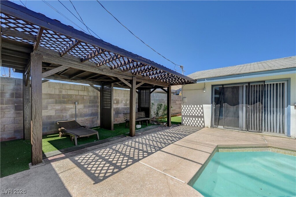 Elegant single-story residence less than a mile from CSN Charleston Campus. This home boasts an open, spacious living area and a modern kitchen featuring stainless steel appliances, granite countertops, and freshly painted cabinetry. Designer tile flooring enhances the main living spaces, with plush carpet in the bedrooms for comfort. Step outside to your private oasis—complete with a sparkling pool and an expansive covered deck, ideal for entertaining or relaxing in style. A rare combination of comfort, convenience, and resort-style living—this home is a must-see!