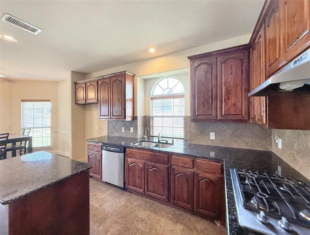 NO DEPOSIT DUE AT MOVE-IN!!! This well-maintained two-story home, located at 3556 Flowing Way in Plano, TX, offers 4 bedrooms, 3 full bathrooms, and 1 half bathroom in the desirable Trails of Glenwood community. The neighborhood boasts a resort-style community pool, an outdoor theater, walking paths, parks, pickleball courts, tennis courts, and a lake. As you enter through the front door, you can retreat to your study through French doors or step into a formal sitting room that flows into the formal dining area. The magnificent open floor plan connects the chef’s kitchen and main living area, with an enchanting winding staircase ushering you to the lofted second living space, overlooking the floor-to-ceiling custom stone fireplace. The first-floor living room is enhanced by vaulted ceilings and grand windows that spill abundant natural light throughout. The kitchen is fully equipped with granite countertops, a center island, gas stove, dishwasher, walk-in pantry, and a butler’s pantry to complement the avid host. Enjoy mornings in the breakfast nook with views of the backyard. A full-size utility room with washer, dryer hookups makes even day-to-day tasks enjoyable. The primary bedroom includes a spa-inspired en suite bathroom and walk-in closet, while the additional bedrooms offer a mix of walk-in and reach-in closets, as well as a balcony walkout. Enjoy the theater experience in your own home with a media room equipped with an XL screen and projector. Surrounding the home, you’ll find lush landscaping, a fenced backyard with a wooden privacy fence, and an expansive porch. Parking is a breeze with a two-car garage and additional covered driveway space. Your new home is just minutes away from Oak Point Park and Nature Preserve and Stoney Hollow Park, encouraging outdoor adventure. Welcome home to your personal retreat in one of Plano’s most exquisite and well-kept neighborhoods! *50% of the security deposit due in month two and 50% due in month three.