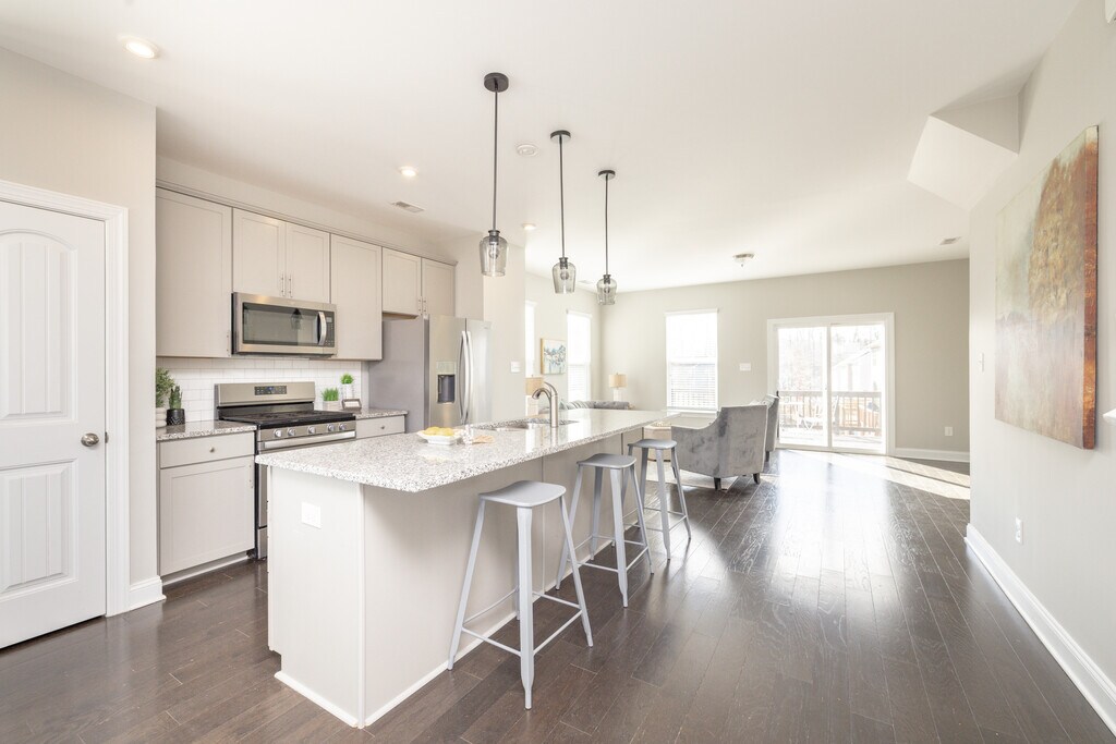 Property Id: 2438659 Beautiful end-unit townhome for RENT in Wynwood at Foxcreek, offering 4 bedrooms, 3.5 baths, and a 1-car rear-entry garage. The entry level features a spacious bedroom with a full bath and walk-in closet perfect for guests or a home office along with beautiful hardwood flooring throughout the foyer. The main level boasts an open-concept layout with hardwood floors, ideal for everyday living and entertaining. The gourmet kitchen is the centerpiece, featuring granite countertops, stainless steel appliances, gas cooking, recessed lighting, and a large island with a breakfast bar, seamlessly flowing into the dining and family room. Step outside to a generous rear deck right off the family room. Upstairs, you'll find three bedrooms, including a spacious primary suite with walk-in closet, and en-suite bath with double vanity, tile flooring, and a walk-in shower. Two additional bedrooms with ample closet space share a full hall bath. The laundry area is conveniently located on the top floor. Enjoy low-maintenance living in a highly desirable community featuring resort-style amenities including a clubhouse, pool, tennis courts, playground, picnic areas, and scenic jogging paths, all conveniently located near shopping, dining, and top-rated schools.