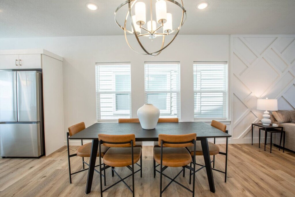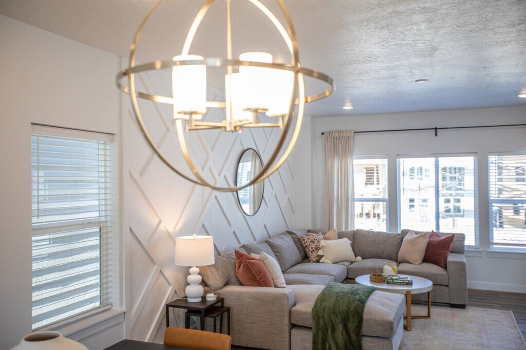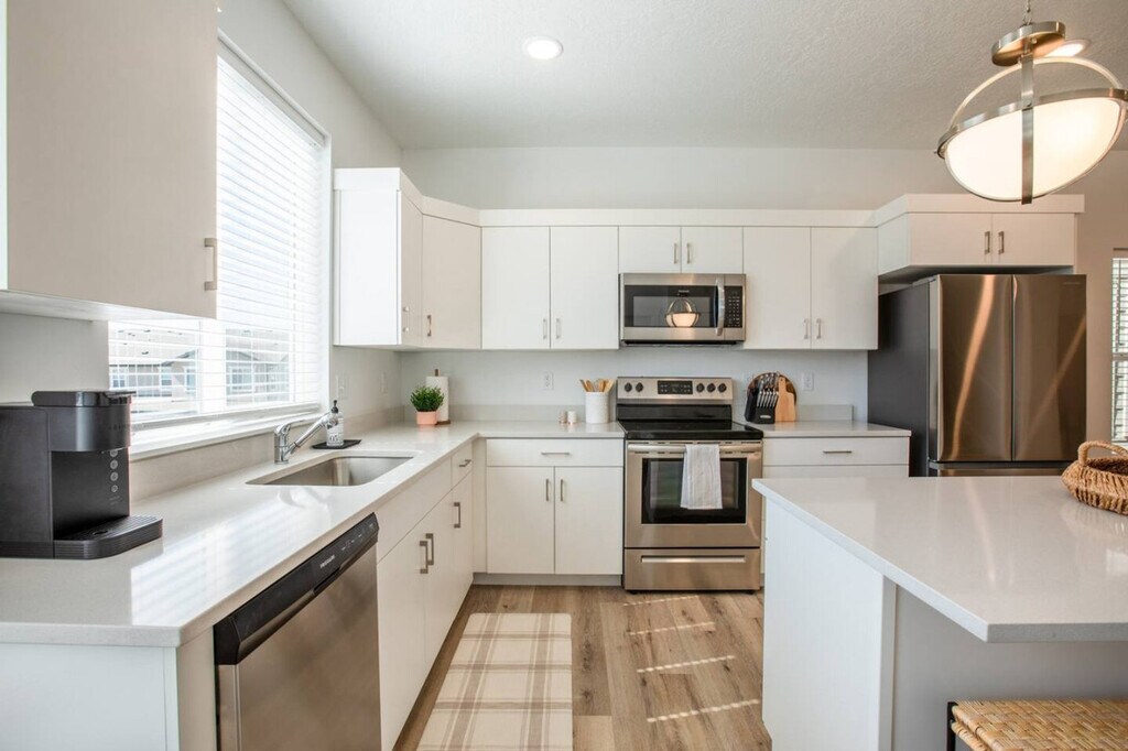 Feel at home in this new mid-century modern townhome located in American Fork. With easy access to American Fork Canyon, you'll be able to easily enjoy all your outdoor activities. The spacious kitchen is fully equipped with modern appliances, including an oven, coffee maker, toaster, and food chopper, making meal prep easy and enjoyable. A dining table seats six, with an additional island bar that accommodates three more. This open-concept space is perfect for gathering and sharing meals. A washer and dryer are available, making laundry tasks simple and efficient. Pets are welcome at the cost of $10 per pet, per day. Local destinations include Sundance Mountain Resort, University of Utah, Delta Center, Salt Palace Convention Center, American Fork Canyon, SLC International Airport, Thanksgiving Point, BYU Stadium, Snowbird Resort, Alta Ski Area, Solitude Ski Resort, Deer Valley Resort and Brighton Resort. No smoking or vaping is allowed on the premises. A $200 per day fee will be assessed for each day of the reservation if it is found that guests have been smoking or vaping on the premises. For unauthorized pets, a $250 fee will be assessed. Quiet hours begin at 10:00 PM each night and continue until sunrise. Moving of furniture is not allowed. A $500 fee will be assessed if the cleaners have to move furniture to reset the property for the next guest. [SI]