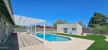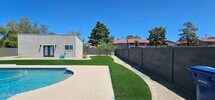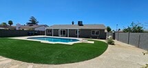 Mesa Pool Home,With A Casita! Nestled on a generous ¼-acre lot with no HOA,this beautifully updated 4-bedroom,2-bathroom primary home features designer paint,vinyl plank flooring throughout,mini blinds,ceiling fans,all kitchen appliances washer/dryer,synthetic lawn,and sparkling diving pool. Pool service IS included. The Casita offers a 450 sqft,1 bed,1 bath,full kitchen and stacked washer and dryer experience.