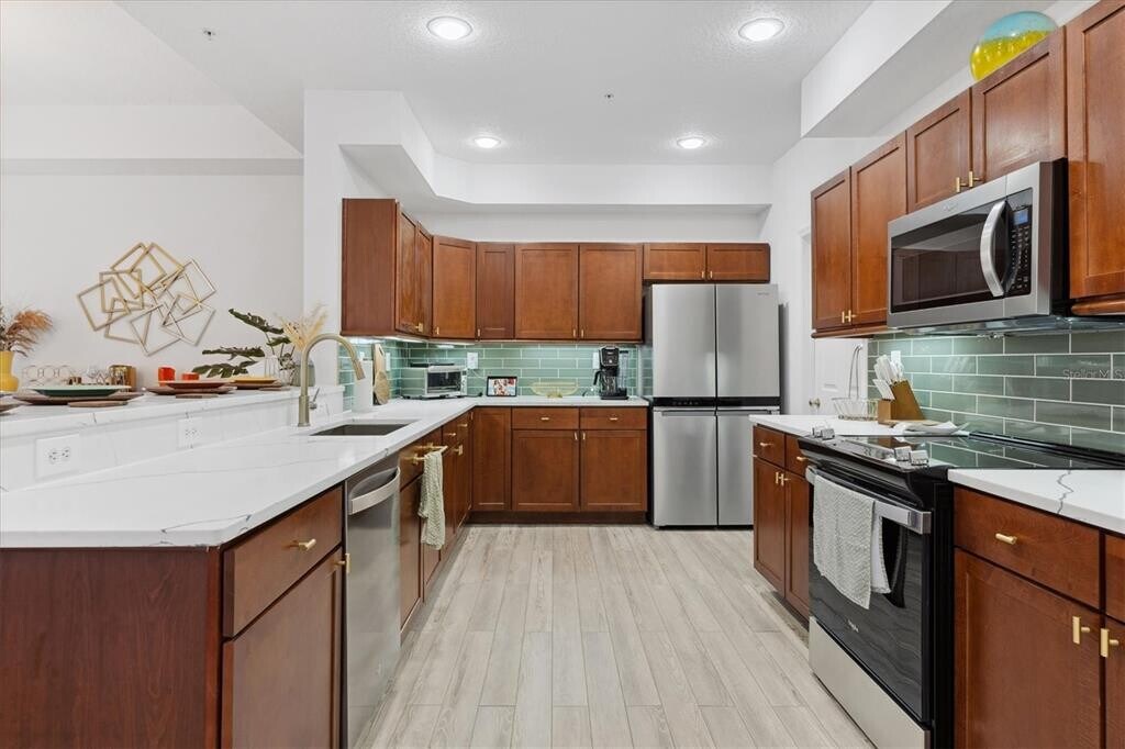 Welcome to the exquisite Wells Court Condominium! This gated community offers a FULLY UPGRADED 2-bed,2-bath condo with a BONUS ROOM,just steps from the newly renovated Coachman Park,Clearwater Beach,amazing restaurants,and so much more! Step inside to enjoy luxury vinyl floors,custom closets throughout,10-foot ceilings,brand-new light fixtures,and a spacious open-concept layout. The modern kitchen features hardwood cabinets,quartz countertops,and new stainless-steel appliances. The primary suite offers a spa-like retreat with a marble-finished bathroom and custom walk-in shower. Additional highlights include a large 2-car garage plus one covered parking spot. Wells Court residents enjoy a clubhouse,swimming pool,fitness center,and direct access to the Pinellas Trail. Walk to Coachman Park for outdoor concerts and community events,or explore Downtown Clearwater’s shops and dining. Feeling beachy? Clearwater Beach is just a quick bike ride or Jolley Trolley trip away! Don’t miss this opportunity for LUXURY LIVING in a prime Clearwater location — move-in ready! MLS# TB8444224