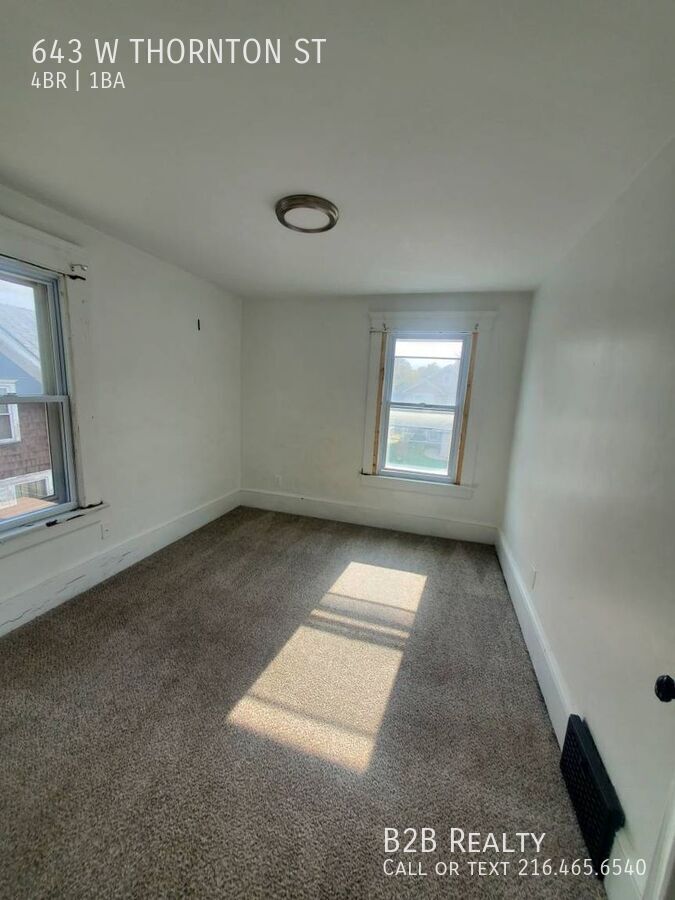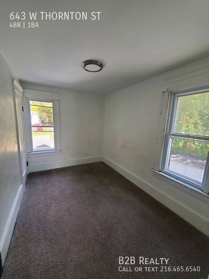 Welcome to your new sanctuary! Situated in a vibrant neighborhood, this charming 4-bedroom property at 643 W THORNTON ST Akron, OH 44307 offers the perfect comfort and convenience. Designed for those seeking a peaceful retreat without sacrificing access to the best the city has to offer, this cozy apartment provides an exceptional living experience. Property Type: • Single Family Option Available: The property offers single-family housing options. Interior Features: • Spacious Living Area: The open-plan living area is designed for relaxation, featuring plush flooring and neutral tones that create a warm and inviting atmosphere. • Modern Kitchen: The kitchen is well-appointed with essential cabinetry and workspace, making meal preparation a breeze. Enjoy the convenience of modern fixtures and ample storage space. • Comfortable Bedroom: The bedroom offers a peaceful oasis, perfect for unwinding after a busy day. Its tranquil setting ensures a good night's sleep. • Updated Bathroom: The bathroom is clean and functional, with modern fixtures that cater to your daily needs. Exterior Features: • Charming Curb Appeal: The property at 643 W THORNTON ST Akron, OH 44307 boasts a charming exterior with a well-maintained facade. The inviting front entrance is complemented by a cozy porch, perfect for enjoying a morning coffee or greeting neighbors. • Landscaped Surroundings: The apartment is nestled within a beautifully landscaped area, offering a green and serene environment. The lush greenery around the property adds to the tranquil atmosphere, providing a refreshing retreat from the city's hustle and bustle. • Private Patio/Balcony: Enjoy your own private outdoor space with a small patio or balcony, ideal for relaxing or entertaining guests. This additional area enhances your living space and offers a personal outdoor retreat. • Parking Availability: Convenient parking options are available for residents, ensuring easy access to your home without the hassle of searching for street parking. • Safe and Secure: The property is situated in a safe neighborhood, providing peace of mind for you and your loved ones. The well-lit exterior and secure entryways further enhance the security of your new home. Location Highlights: • Convenient Access: Situated in a desirable neighborhood, this property provides easy access to local shops, dining, and entertainment options. Whether you’re a busy professional or a student, you’ll appreciate the convenience of having amenities close by. • Vibrant Community: The surrounding area is known for its friendly community atmosphere and offers plenty of opportunities to explore and engage with your neighbors. Additional Information: • Screening: We charge a $25 fee per person over the age of 18 for background checks. Our comprehensive screening process includes credit, background, and eviction checks as well as verification of income, job history, and landlord references. We strive to approve tenants who may not initially think they qualify. Resident Benefit Package: Our mandatory Resident Benefit Package is designed to make your life easier, rewarding, and stress-free. Here’s what you get: Pest Share Protection: Covers control for bed bugs, fleas, mites, ticks, & weevils. Credit Building: Boost your credit score with every rent payment—we report it for you! Resident Rewards: Earn cash and discounts worth up to $4,500 annually. No ACH Fees: Enjoy waived $2.49 ACH fees on all online payments. 24/7 Maintenance Line: Round-the-clock access to ensure peace of mind. NSF Fee Waiver: Get one non-sufficient funds (NSF) fee waived per tenancy. Move-in Concierge: One call to set up utilities, cable, and internet. SmartLock Access & FREE Lockbox: Convenient move-in with advanced security. Online Rent Payments & Portal Access: Easy access to your payments and account overview. Vetted Vendor Program: Only insured vendors will service your unit for extra reliability. Security Deposit Waived via Obligo: A flexible, affordable alternative to traditional deposits, offering financial freedom and peace of mind. Take advantage of this comprehensive package for just $49.50/month, designed to enhance your living experience while saving you time and money! • Neighborhood Insight: To get a true sense of the area, we recommend visiting the property at different times of the day. This will give you a realistic feel for the neighborhood’s ambiance and what to expect. • Maintenance: B2B Realty ensures that all properties are safe and well-maintained. While tenants are not permitted to make changes or repairs to the property, our dedicated maintenance team is always available to address any issues. Pet Policy: We welcome pets with an additional fee of $30 per month. Please note that we do not require a pet deposit. Lease Terms • Dogs ok up to 25 lbs • Cats ok Availability: • Section 8 Accepted: We are pleased to accept Section 8 vouchers for this property. • Self-Paying Tenants Welcome: This property is also available for self-paying tenants. Contact Us: Don’t miss this incredible opportunity to avail 643 W THORNTON ST Akron, OH 44307 as your new home. Contact B2B Realty today to schedule a viewing and discover what makes this property so special. Our friendly team is ready to assist you with any questions you may have and help you through the application process. B2B Realty Phone: Call or text to schedule a tour today!