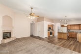 Reduced income requirement for applicants with excellent credit and references! This lovely 3-bedroom gem with a 2-car garage in the desirable Highland at Arrowhead is now available for quick move in! Discover a generously sized living/dining room & a sizable family room w/a cozy fireplace that seamlessly flows into the kitchen. With its vaulted ceilings,soothing paint,tile/wood-style floors,& soft carpet in all the right places,this home exudes charm. The well-kept kitchen is fully equipped w/track lighting,granite counters,wood cabinetry,a mosaic tile backsplash,a pantry,a breakfast nook,& an island w/a breakfast bar. The sizable den is ideal for a home office. Retreat to the main suite,offering a full bathroom w/dual sinks,a separate tub,& a walk-in closet. The vast backyard w/a covered patio,lush grassy lawn,& a storage shed promises a serene,relaxing spot. Take advantage of this adorable abode!