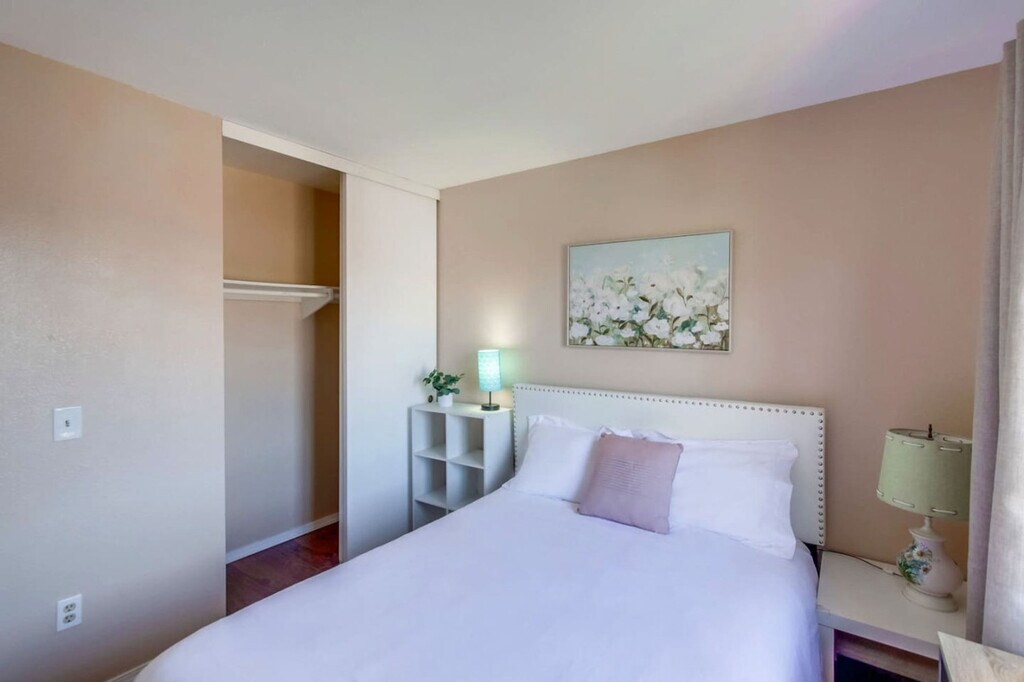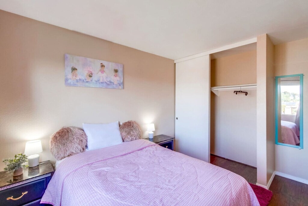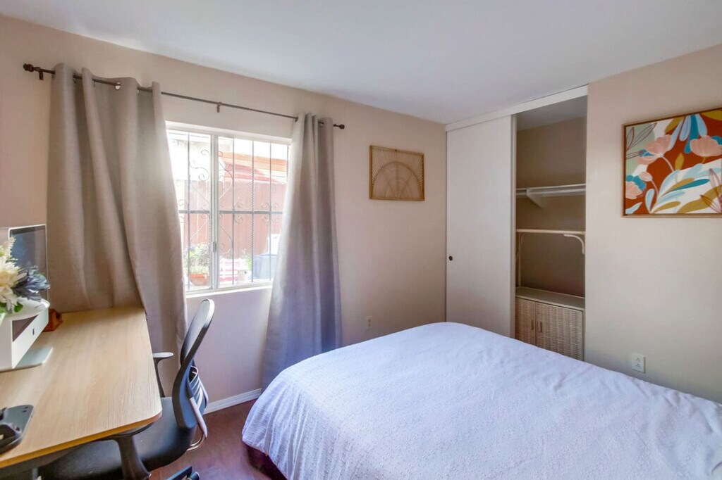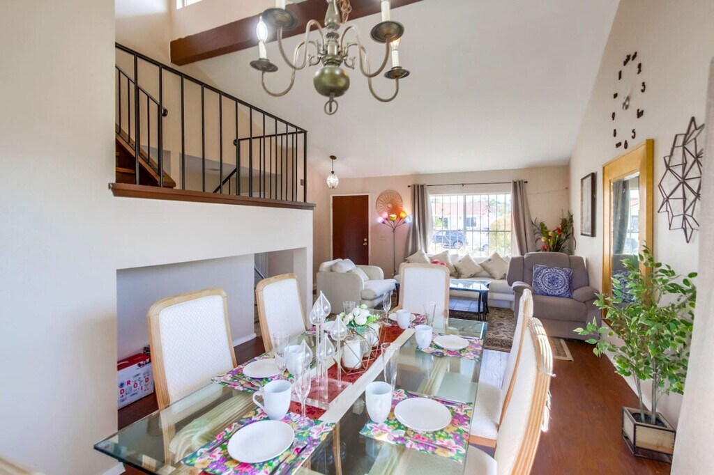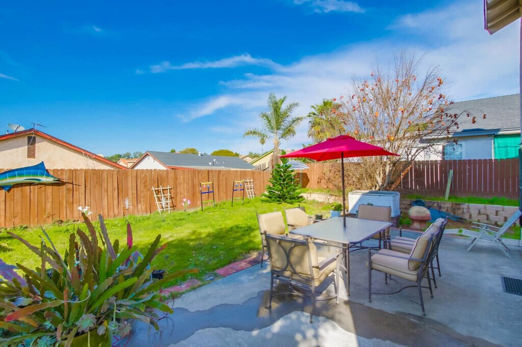 Welcome to this 4-bedroom home in San Diego, offering 1,634 Sqft of living space. Feel at home in this spacious property. The kitchen is fully equipped for all your culinary needs, featuring a gas stove/oven, blender, toaster, cooking pans, baking trays, and essential supplies like coffee, oil, and sugar. Modern appliances include a coffee machine, microwave, and fridge. The air-conditioned living room features a flat-screen smart TV with cable and Roku for Netflix, YouTube, and Disney+. The bedrooms are furnished with 3 queen beds with cozy linens and ample pillows. The master bedroom includes a king-size bed, a baby crib with en-suite bathroom, a smart TV, and a workspace. The bathroom is fully stocked with shampoo, body wash, a hairdryer, and fresh towels. Garage parking is available for 2 cars. Pets are welcome. Located within 5-10 minutes of shopping centers and local restaurants, this home offers a convenient location. Please smoke outside of the home only. No loud noise, loud music, yelling, or screaming is allowed at any time during your whole reservation to avoid neighbor’s complaints. To avoid neighbors calling the police, lower all noise and close windows to avoid noise going outside of the house. Any activities after 9 PM need to be inside the house with all doors and windows closed to prevent noise. If neighbors complain or you violate the noise house rule multiple times, there is a $1000 fine for the violation. Each unauthorized guest or pet will incur a $100 per night penalty. Do not download illegal content using the Wi-Fi. Do not put trash or toilet paper in the toilet bowls because clogged toilets or plumbing issues can result in a bill of $300-$500. No DJ allowed, with a $1000 fine for violations. Includes a choice of desks and chairs inside and outside, plus 500Mbps Wi-Fi. [SI]