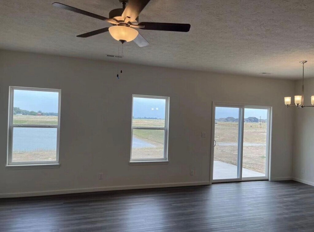 Newer Ranch Style House East Lafayette offers a single-level layout with a split floor plan and three bedrooms, two bathrooms, and an attached two-car garage. The open-concept common area includes an eat-in kitchen with a kitchen island with seating, 9' ceilings, and vinyl plank flooring throughout. The master suite features a double sink and a walk-in shower. Outside, enjoy a pond view from the property.