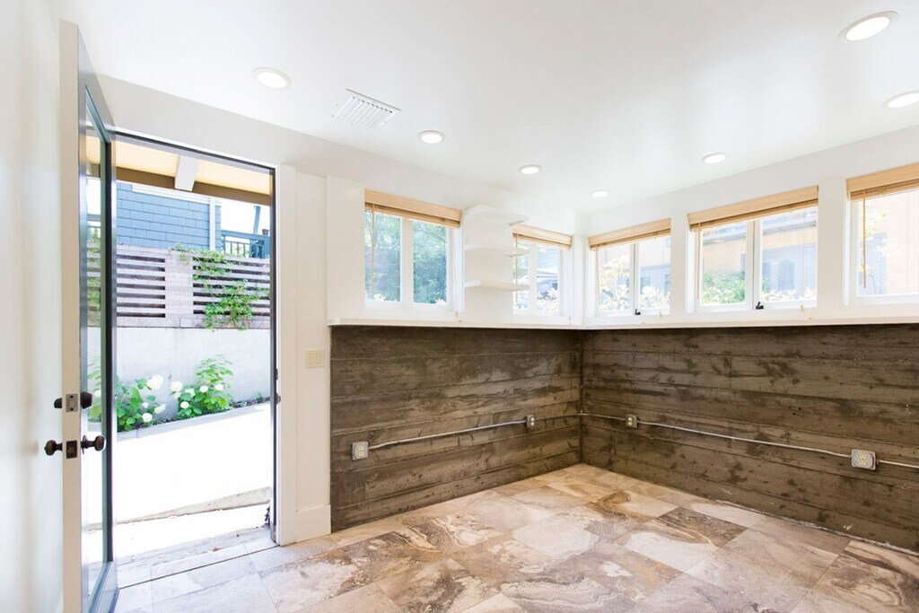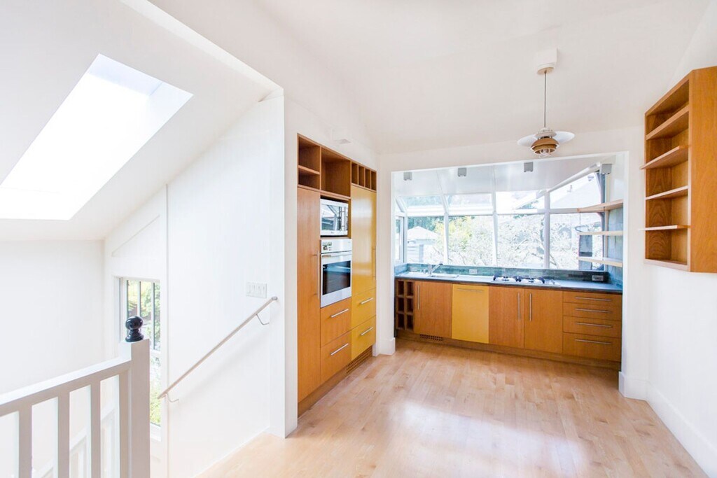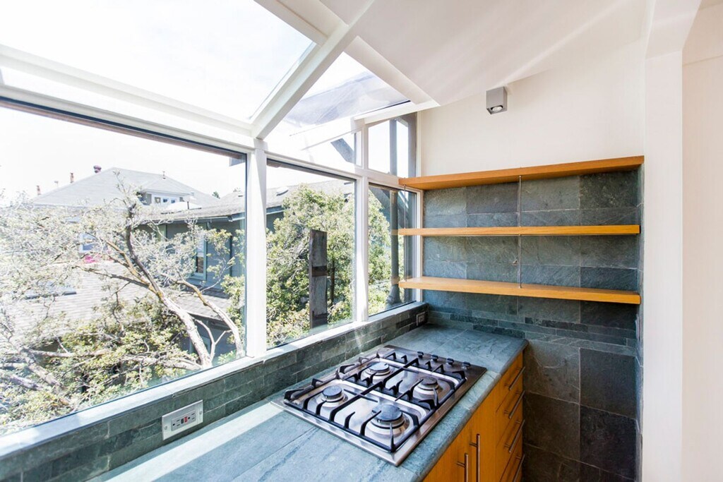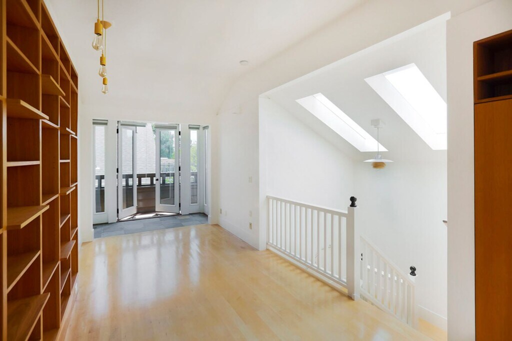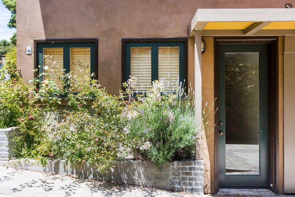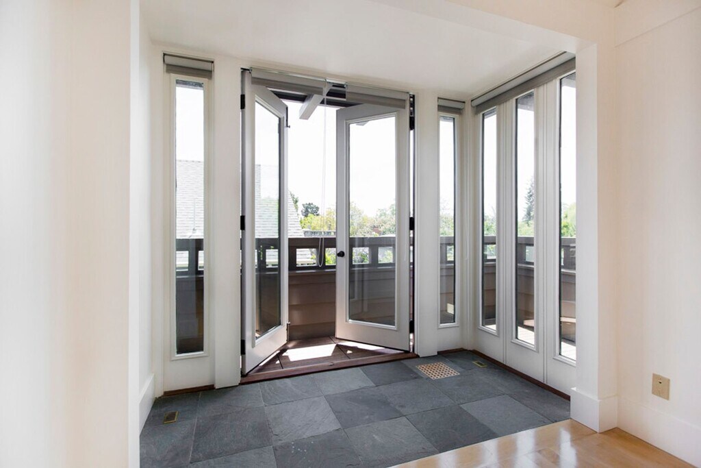 This quiet, three-story, one-bedroom apartment has lots of character and great amenities. Set back from the street, the unit was designed with the kitchen, dining area, and living room upstairs, and the bedroom and bathroom on the 2nd floor, and an office on the ground floor. This thoughtful living space has been recently remodeled with high-end stainless steel appliances, including a dishwasher, garbage disposal, gas stove, built-in microwave, and refrigerator, plus custom cabinetry with convenient and eye-pleasing built-in storage (and a light-filled living room with French doors that open onto a private deck). The deck, perfect for a small table set to enjoy your morning coffee or tea, overlooks a private courtyard. The bedroom features built-in reading lights, a ceiling fan, built-in drawers for clothing storage, and other various nooks for your belongings. The bright bathroom has a walk-in tiled shower, under-sink storage, and a large skylight. Located in the pleasant, coveted Elmwood district, this apartment is an easy walk to all the shops and restaurants of College Ave, such as La Farine Boulangerie Patisserie, Cole Coffee, and Boichik Bagels—a 14-minute walk to Rockridge BART, or a 30-minute walk or 10-minute bike ride to the University. Just steps away from Safeway and Peet's—96 walk score. Permit parking is available on the street. Laundry machines are shared with only one other unit and are located below the apartment. Comcast Internet/Cable Ready. No pets or smokers. Landlord pays for water and garbage/recycling/compost. $1000 deposit due upon lease signing. One-year lease.