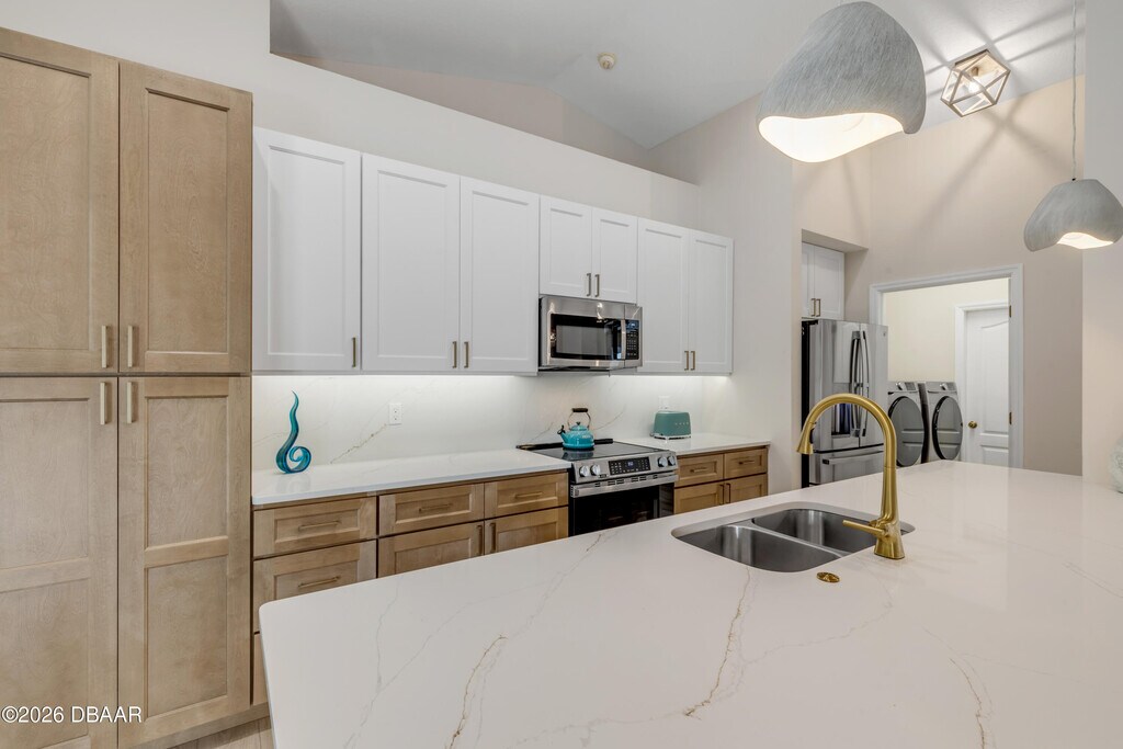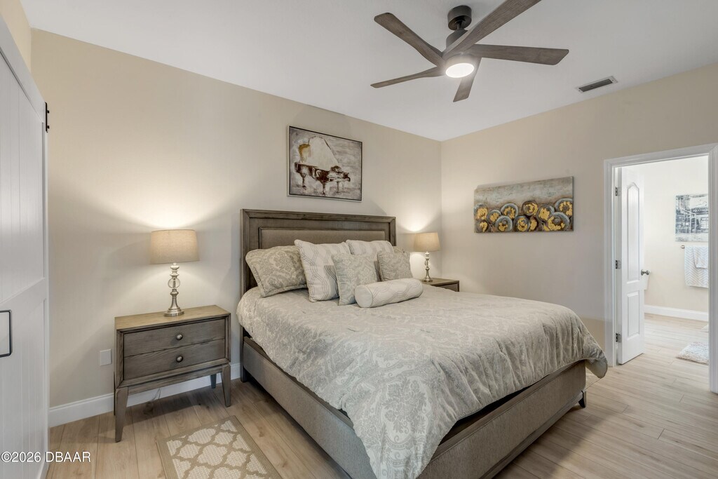 This property is managed privately by the owners. You will NOT ever have to deal with a Property Management Company. Completely renovated and impeccably designed,this stunning 3-bedroom,2-bath ranch-style home is now available for annual lease in one of the most desirable beachside locations of New Smyrna Beach. Situated on a rare 100x100 double lot,this property offers both space and style just moments from everything that makes coastal living exceptional. Step inside to a bright,open-concept floor plan featuring vaulted ceilings in the main living area and high-end vinyl plank flooring throughout. The show-stopping 13-foot oversized island is perfect for entertaining,casual dining,or gathering with friends and family. The spacious living and dining areas flow seamlessly,complemented by gorgeous quartz countertops and a designer backsplash that elevate the entire space. The primary suite is a true retreat,offering a beautifully updated bathroom with an extra-long vanity,a luxurious walk-in shower,and an expansive,over-the-top walk-in closet that provides exceptional storage. A charming sunroom adds additional flexible living space,ideal for relaxing or working from home. Enjoy outdoor living with a fully fenced yard and a beautiful back deck perfect for entertaining or unwinding in privacy. Pets are welcome. Location truly sets this home apart just a short walk to the beach,the Intracoastal Waterway,and all the shops,restaurants,and nightlife of Flagler Avenue. Also within walking distance to local favorites like Norwood's and The Garlic. Available for $4,500 per month with a one-year lease. Experience the best of beachside living location,luxury,and lifestyle all in one.