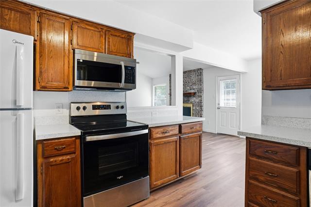 Welcome to 6464 High Lawn Terrace, a charming 3-bedroom, 2-bathroom home nestled in a friendly, established Watauga neighborhood. Step inside to find a bright, open floor plan designed for comfort and easy living. The spacious living room features a beautiful brick fireplace as its focal point and is filled with natural light from large windows. The kitchen offers abundant counter space, crisp white finishes, and a cheery breakfast nook overlooking the yard—perfect for casual dining or morning coffee. Throughout the home, a neutral palette creates a warm, welcoming feel that complements any style. Outside, enjoy a fully fenced backyard with plenty of room to relax, garden, or play. The large, private yard offers endless possibilities for outdoor gatherings or quiet evenings under the Texas sky. This single-level home blends function and charm in one inviting package—move-in ready and waiting to welcome you home. Please note the pet deposit is $175 and the nonrefundable pet fee of $200; both per animal.