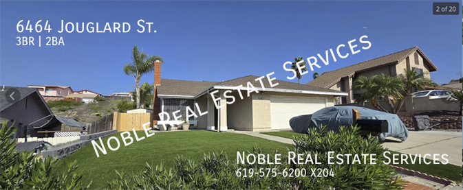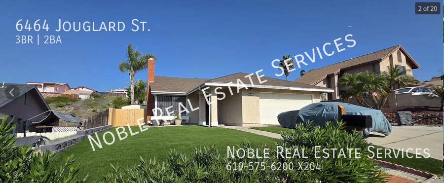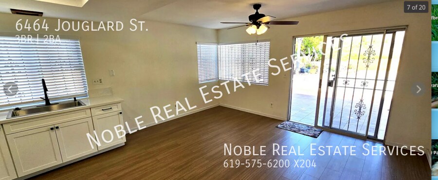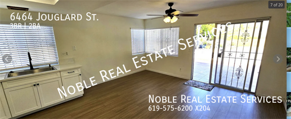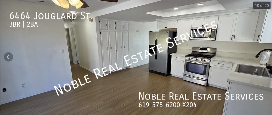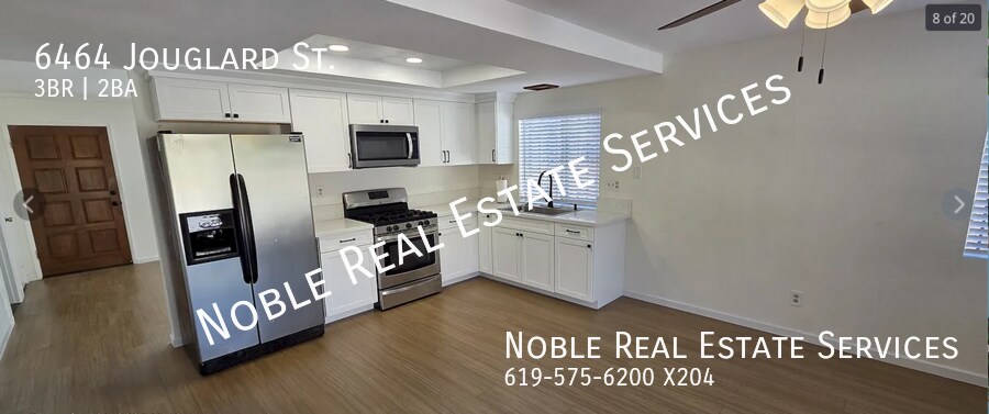 3495.00 Dogs OK Cats OK Pets Ok. (Breed Restrictions Apply) No Yes Deposit: $3495 **On Approved Credit** WONDERFUL SINGLE-STORY HOME WITH A VIEW! This beautifully remodeled home features a brand-new kitchen with stainless steel appliances, laminate flooring throughout, remodeled bathrooms, washer and dryer, and a huge backyard perfect for entertaining. A must-see to appreciate! I YR LEASE, TENANT PAYS FOR ALL UTILITIES AND NO AGGRESSIVE BREED DOGS! (**If no showtimes are available, don’t worry! Go ahead and submit your info and our automated system will let you know when showtimes become available). Also, please be sure to click on the 'Apply Now' button to see all of our requirements and how we work! SS/yc 12/05/2025 No Noble Real Estate Services www.NobleProperties.info 1371 Presioca St. Spring Valley CA 91977 3495 Yolanda ,Emily , Or Alex option 1 2025/12/5 Appliances Kitchen Laminate Flooring