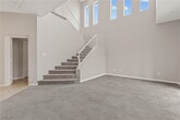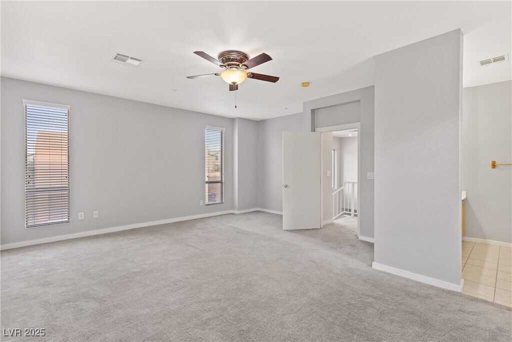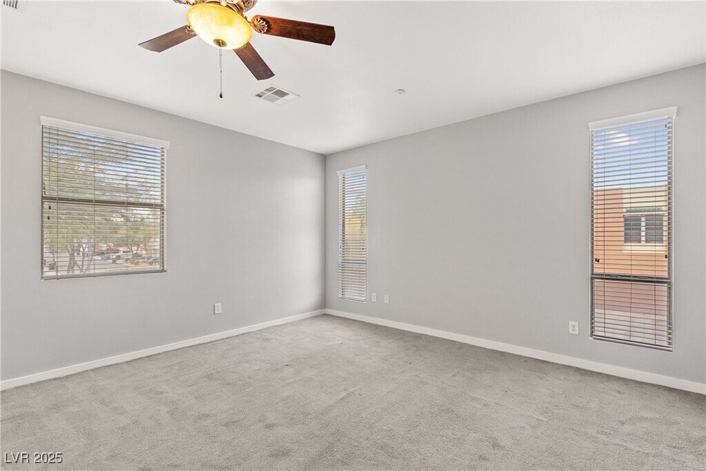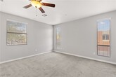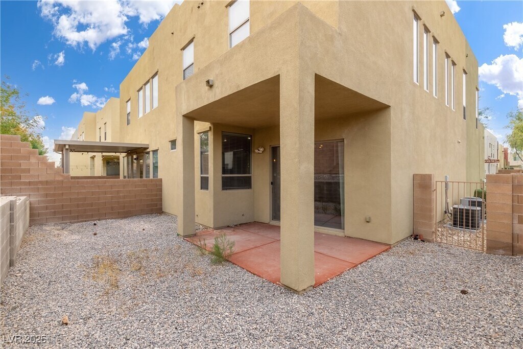 Welcome to this lovely two-story home featuring 3 bedrooms and 2.5 bathrooms, this residence offers an inviting open floorplan with impressive 20-foot ceilings that fill the space with natural light and create a grand, airy atmosphere the moment you walk in. The spacious living area flows seamlessly into the dining space and kitchen, making it perfect for entertaining or everyday comfort. Step outside to a covered rear patio, ideal for outdoor dining or relaxing in the shade. Ceiling fans are installed throughout the home for added comfort year-round. Upstairs, the large primary bedroom provides a peaceful retreat with its own ceiling fan and an upgraded custom built-in closet system, offering exceptional organization and storage. Two additional bedrooms share a well-appointed full bathroom, and a convenient half bath is located downstairs for guests. Located near parks, shopping, dining, and major roadways, this home offers convenience, comfort, and style in a secure gated setting.
