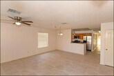 A clean-lined facade and desert landscaping set the tone for this efficient 3-bedroom,2-bath single-story home. Inside,an open living-dining area spans durable tile floors,keeping upkeep simple and the flow effortless. The kitchen stays connected with a bar opening,ample cabinetry,and stainless refrigerator alongside range,microwave,and dishwasher. A cozy fireplace anchors the main living space for cooler evenings,while refrigerated cooling supports comfort when temperatures climb. The primary bedroom is positioned for privacy with an en-suite bath,and two additional bedrooms provide flexible space for a studio,office,or guest room. Laundry is streamlined with included washer and dryer. A spacious private backyard invites outdoor seating and weekend unwinding,plus the bonus of an attached garage. Close to Rio Plaza and convenient Doniphan-area routes for quick errands. Deposit-Free Renting service to Obligo qualified renters,fees may apply.
