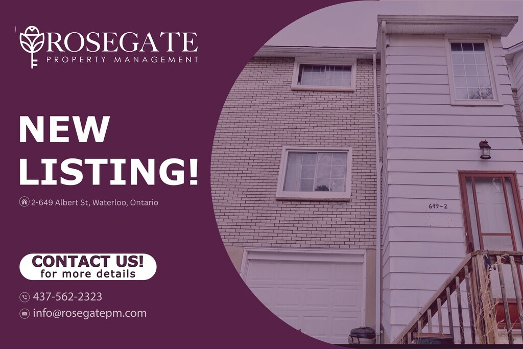 Spacious 3-Bedroom Stacked Townhouse with Garage & Backyard in Waterloo Welcome to 2–649 Albert St, Waterloo — a well-maintained stacked townhouse offering approximately 1,100 sq. ft. of comfortable living space in a convenient and family-friendly neighbourhood. Featuring 3 bedrooms and 1.5 bathrooms, this pet-friendly home is ideal for families, professionals, or students seeking a professionally managed Ontario rental property.The functional layout includes bright living and dining areas designed for everyday comfort. The primary bedroom features a walk-in closet, providing excellent storage and added convenience. All bedrooms are well-sized, offering flexibility for family living, work-from-home setups, or shared accommodations.Enjoy outdoor living with a front porch and backyard, perfect for relaxing or spending time outdoors. Parking is easy with one dedicated parking space and a private garage, a rare and valuable feature for a townhouse-style rental in Waterloo.Professionally managed by Rosegate Property Management, a trusted Ontario rental property management company, this Waterloo townhouse for rent is located close to universities, transit, shopping, parks, and everyday amenities. A spacious, pet-friendly rental with garage and outdoor space — schedule your viewing today.