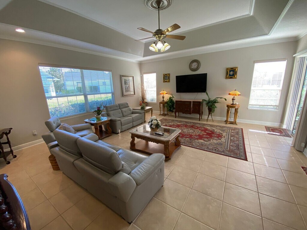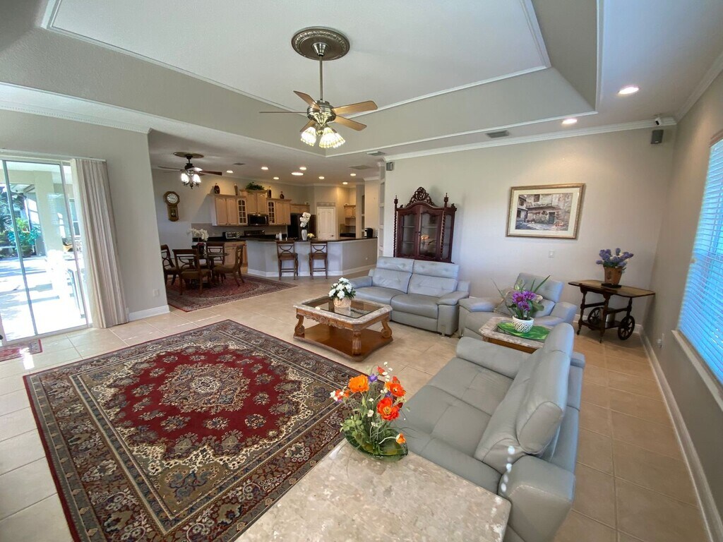 This luxurious, fully furnished, tastefully decorated 4 bed, 3 bath St. Augustine Designer Home is located in the highly sought after Village of Bridgeport. This is a large, upscale 3,682 sq. ft home, on an expansive lot, with beautiful landscaping and an inviting entryway. As you enter the home you are greeted with a formal, large living room with a fireplace, 12 foot high ceilings throughout the home, a large, separate dining room with seating for 8, an expansive kitchen with generous granite counter-tops and cabinets, and an eating area situated next to the kitchen. Enjoy the expansive family room where you can relax or entertain guests. The primary bedroom ensuite includes a king-size bed, TV, with a large, comfortable seating area, a large bathroom featuring a walk-in shower, double sinks, soaking spa tub and a large, spacious walk-in closet and second closet, in addition to separate enclosures for shoes and purses, etc. The first guest bedroom is spacious with a closet, queen-size bed, dresser and nightstands. The second guest bedroom has a convertible sofa, TV and closet with a shared large bathroom with a shower/tub situated between the guest bedrooms. The fourth bedroom has been converted to a large office with 2 built-in desks, overlooking the front garden. The large third bathroom with a shower is accessible to both the main house as well as a second entrance from the enormous fully screened in lanai. The 596 sq. ft. lanai is an entertainers’ dream come true, with an outdoor/summer kitchen, ample seating areas and access to the magnificent gardens and additional entertaining areas. The garage is an oversized 3 car garage with ample room for at least 2 cars, plus golf carts and a work bench with 2 ceiling fans, a large T.V. and plenty of storage. The garage leads into the house through the laundry room that includes a folding table and built in ironing board. The property is set up for an ADT security system throughout. There is also a Generac natural gas-powered generator system, 2 separate HVAC systems, 2 recirculating hot water heaters on either end of the house, solar power panels to keep your electrical costs at the property to a minimum. There is also a pre-wired Tesla charging system already set up. This amazing property has it all and then some. If you want to live The Villages lifestyle the right way, this is the place. This Magnificent property can also be rented for the 2026 Season (January, February, March and/or April at $8000.00 per month. On an annual Lease the Tenant(s) are responsible for all utilities. The tenant(s) will receive a supplemental bill from management monthly for their; Water, Sewer and Sanitation usage. The Owners pay Irrigation and Villages Amenities Fees.