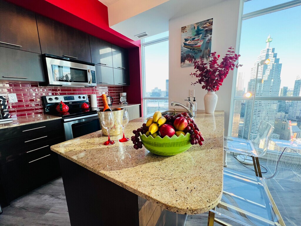 Stunning Penthouse Retreat with Epic Lake & CN Tower Views – Your Dream Toronto Escape Awaits! Imagine waking up to panoramic sunrises over Lake Ontario and the iconic CN Tower lighting up your night – this isn't just a rental, it's your ultimate urban oasis! This modern 2-bedroom penthouse boasts massive living space flooded with natural light from floor-to-ceiling windows wrapping around every corner. Designed with high-end luxury furnishings, a fully equipped gourmet kitchen (perfect for whipping up meals or hosting intimate dinners), and premium finishes that scream sophistication. Whether you're relaxing on the plush sofa or entertaining friends, this space is built for comfort and style – ideal for long-term stays where you can truly make it your own! Viral-Worthy Location Alert! Nestled in the heart of downtown Toronto, you're steps away from the vibrant energy of King Street West (trendy bars, restaurants, and shops galore!), Exhibition Place for events and festivals, the iconic CN Tower for skyline adventures, Metro Convention Center for business pros, and even Billy Bishop Airport for seamless travel. Walk, bike, or hop on transit – this spot puts the best of Toronto at your doorstep. Pro tip: Snap that Insta-worthy view from your window and watch the likes roll in! The Space at a Glance: Bedrooms : 2 spacious rooms with cozy, high-quality bedding. Bathrooms : 2 modern baths stocked with essentials. Living Area : Expansive open-concept layout perfect for remote work, family time, or unwinding. Kitchen : Fully stocked with appliances, cookware, and everything you need to channel your inner chef. Extras : High-speed Wi-Fi, smart TV, in-unit laundry, and luxury linens – all furnished and ready for move-in! House Rules – Keeping the Vibes Positive: Suitable for families: (2-12 years) and infants (under 2) welcome! Pet-friendly: Well-behaved furry friends allowed (considered additional guests – let's chat details). No smoking, parties, or events – respect the space like it's your own! Additional guidelines: No shoes inside, keep noise low in common areas and unit after 11:30 PM, and no unauthorized video/photoshoots (ask first for content creation approvals). Secure entry: Keyless access powered by August Home for easy, contactless check-ins. Ready to live the Toronto dream? This penthouse isn't just a place to stay – it's where memories (and epic selfies) are made! Inquire now for flexible long-term rates and make this your home base. DM or apply today – spots like this go fast!#TorontoLiving #PenthouseViews #FurnishedRental #CNtowerVibes