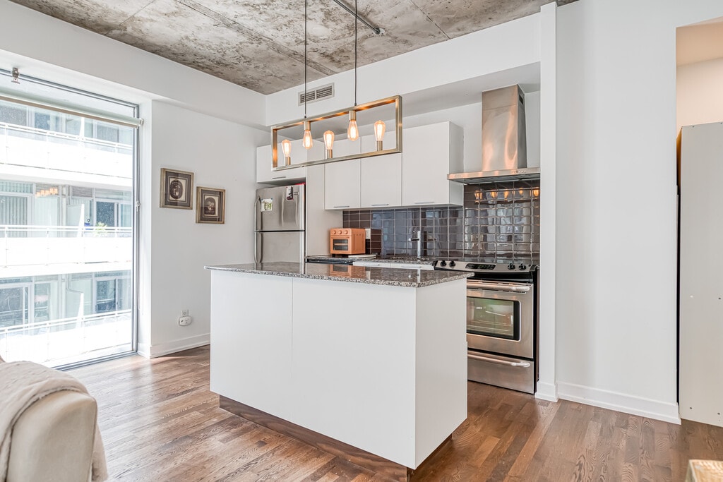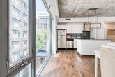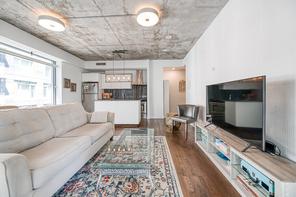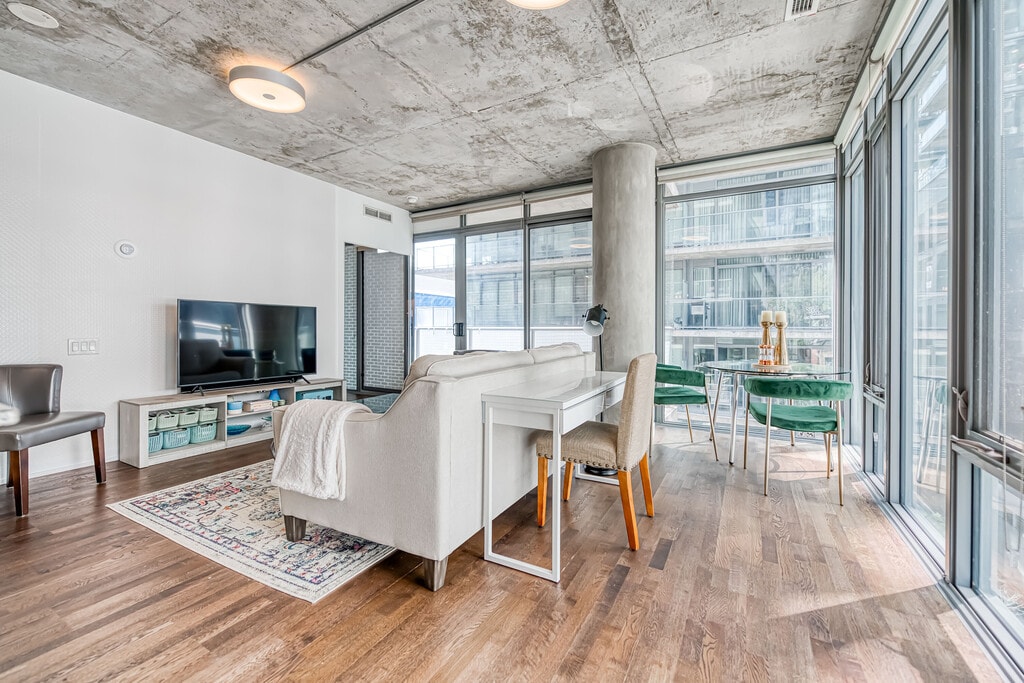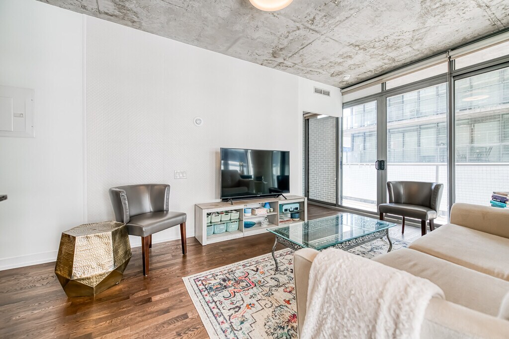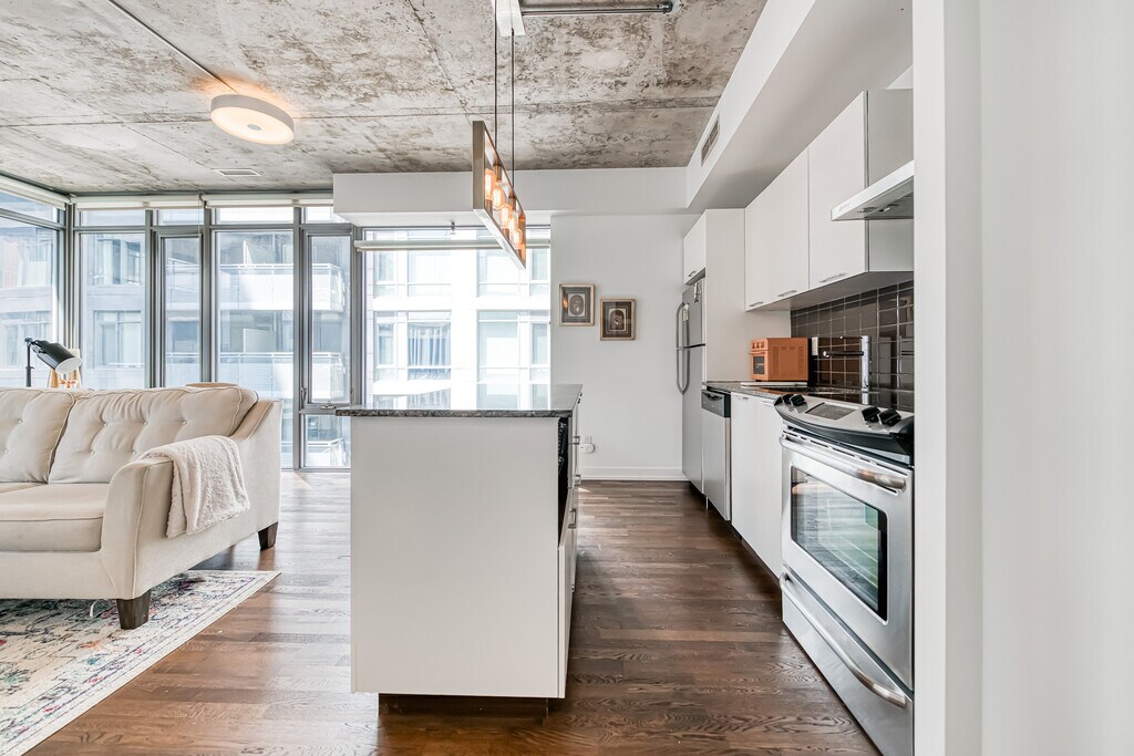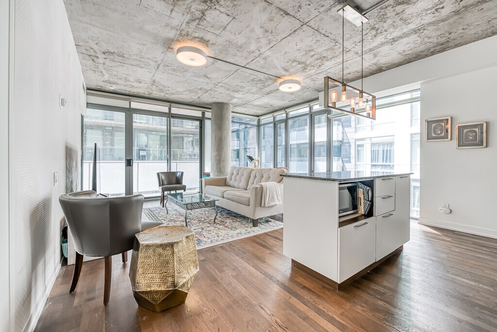 Stylish and Fully Furnished Corner Unit in the Heart of King West! This bright, open-concept 1-bedroom suite offers nearly 700 Square feet of living space, comfortable and modern furniture and a welcoming layout ideal for urban living. Featuring floor-to-ceiling windows, a spacious balcony, exposed 9-foot concrete ceilings, and hardwood floors throughout. Enjoy a sleek kitchen with stainless steel appliances, granite countertops, and a functional kitchen island. Located in a trendy boutique building with transit at your doorstep and steps to top restaurants, shops, and nightlife.