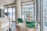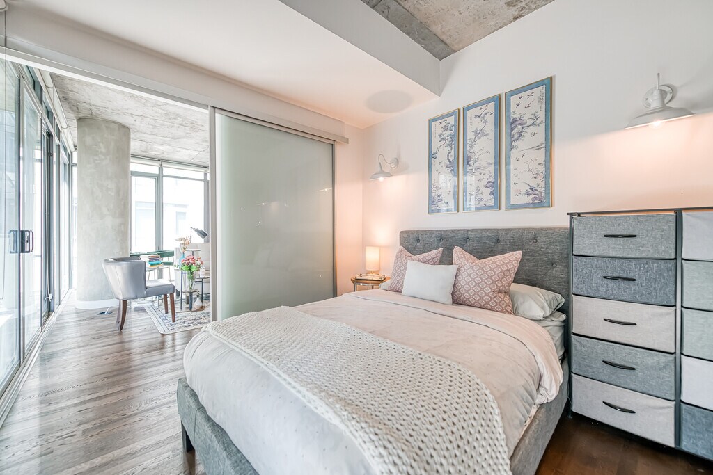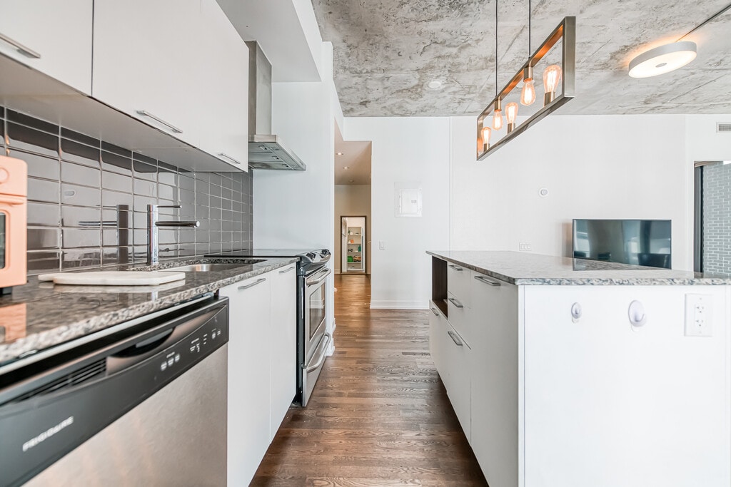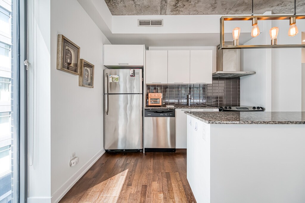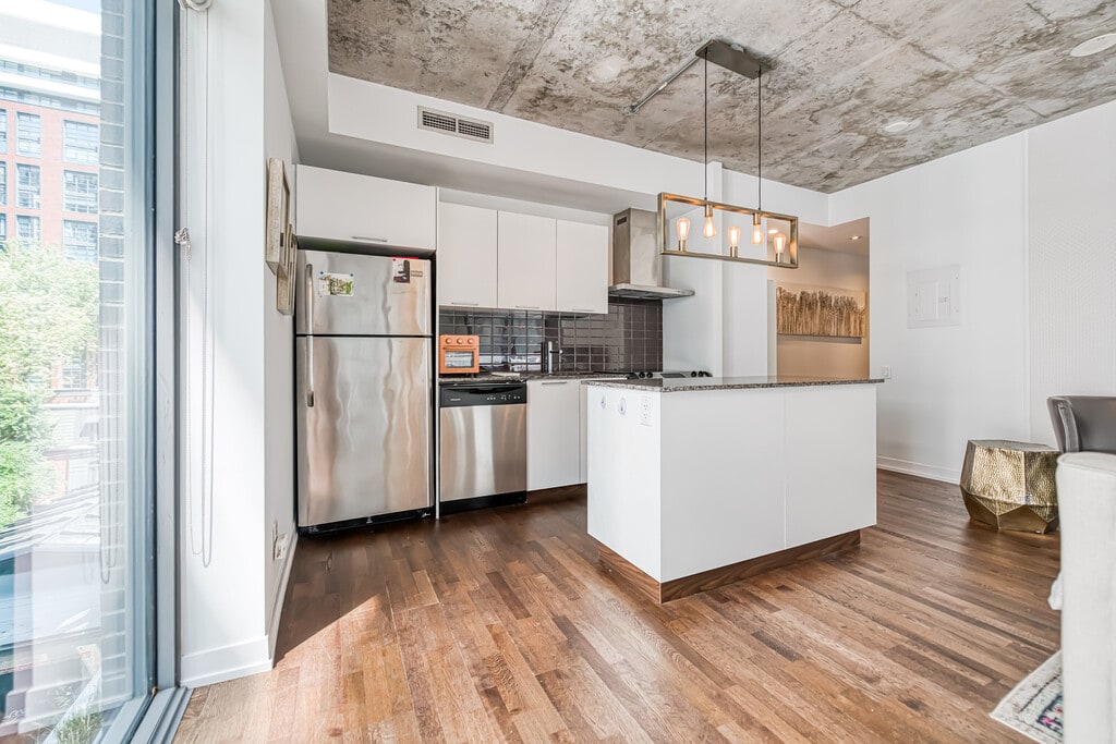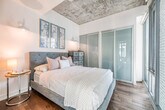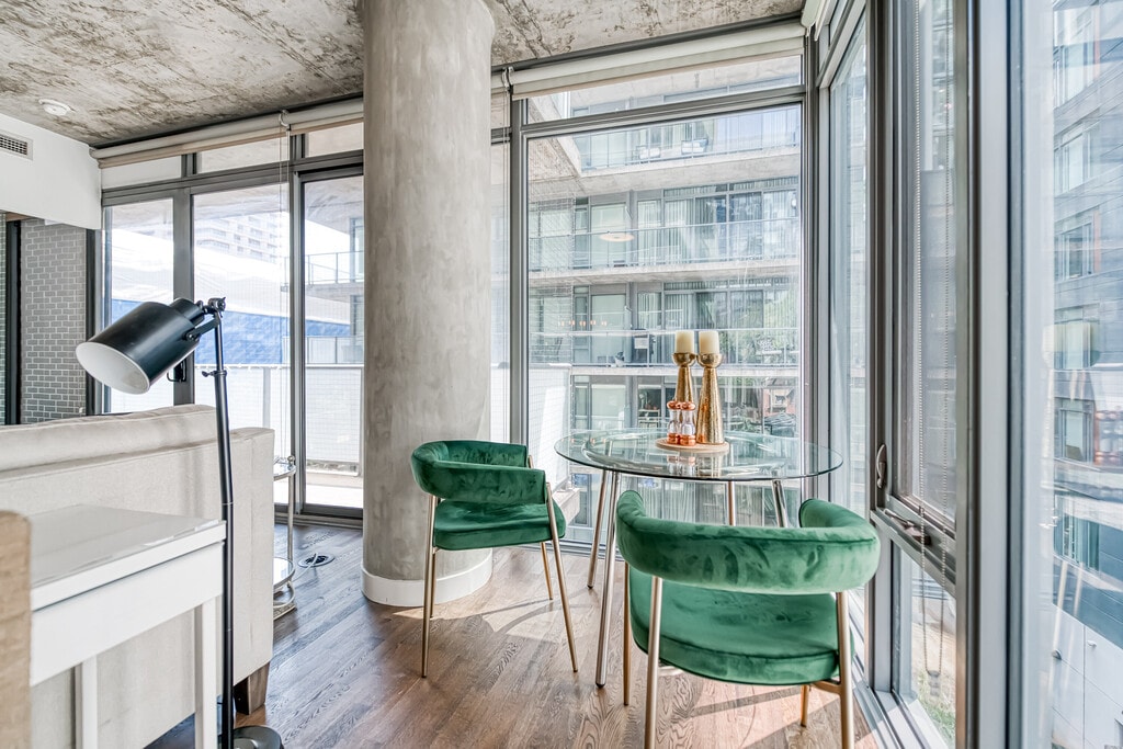 Stylish and Fully Furnished Corner Unit in the Heart of King West! This bright, open-concept 1-bedroom suite offers nearly 700 Square feet of living space, comfortable and modern furniture and a welcoming layout ideal for urban living. Featuring floor-to-ceiling windows, a spacious balcony, exposed 9-foot concrete ceilings, and hardwood floors throughout. Enjoy a sleek kitchen with stainless steel appliances, granite countertops, and a functional kitchen island. Located in a trendy boutique building with transit at your doorstep and steps to top restaurants, shops, and nightlife.