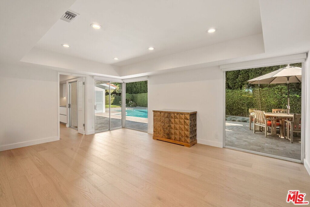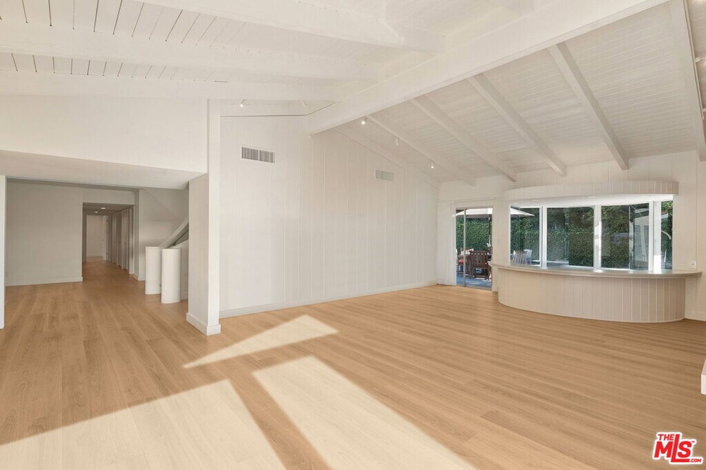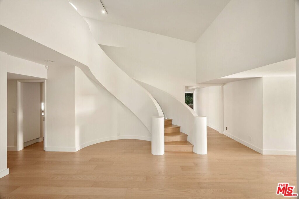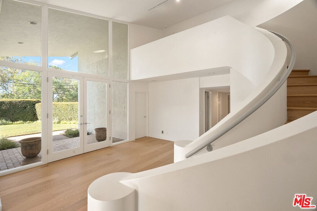 Set behind gates in desirable Brentwood, this bright and airy residence embodies the essence of California living. The spacious floor plan features four bedrooms plus an office, with seamless indoor-outdoor flow through expansive glass sliding doors. Designed for entertaining, the home offers two living rooms, a separate dining room, and a circular bar overlooking the pool and lush garden. The new kitchen opens to a sunny eat-in area, while soaring double-height ceilings in the foyer and a striking curved staircase add architectural drama. The private primary suite includes a sitting area with views of the city lights, creating a tranquil retreat. Outdoors, enjoy a large landscaped garden surrounded by mature hedges, offering privacy and a serene backdrop for gatherings by the pool. MLS# 25607725