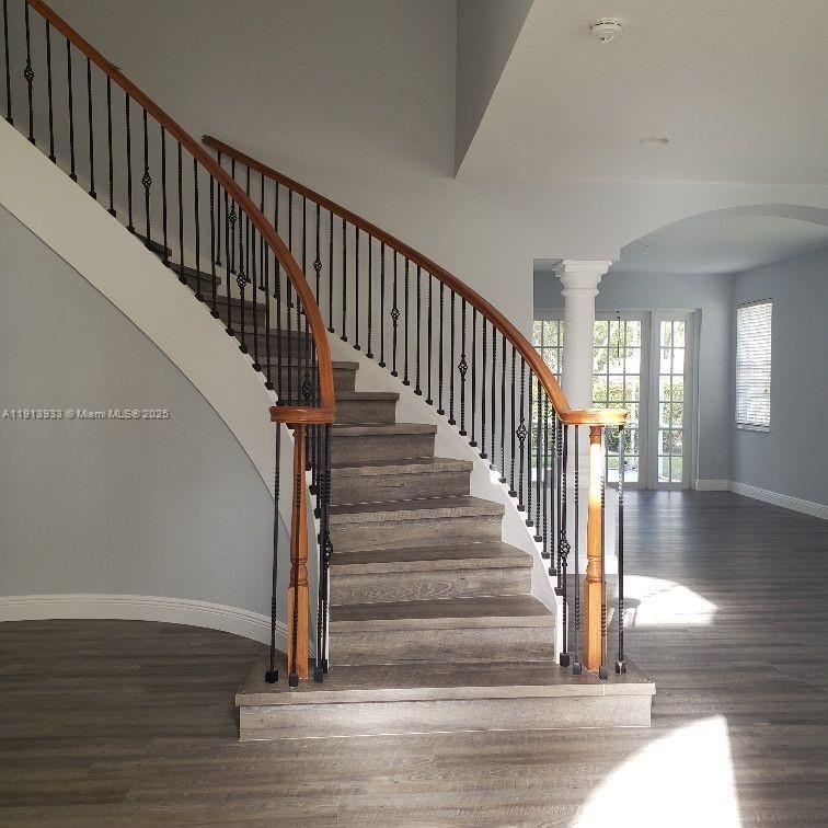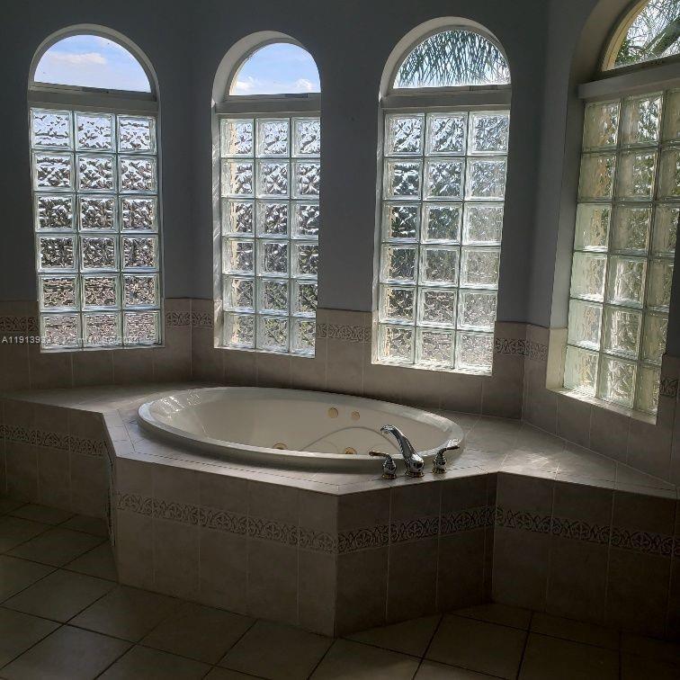 Lovely corner house with grand entry; double door opens to a beautiful curved stairway. Formal living room and dining room with stone columns. There is one bedroom downstairs and four upstairs. Vinyl flooring throughout entire home. Upgraded kitchen overlooking family room with french doors leading out to the back screen patio and includes outdoor granite bar for entertaining. Hugh side yard all fenced in and high hedges for privacy. Master bedroom with private balcony, a sitting area, his/her own bathrooms and enormous closet. Attached 3 car garage. Community is man-gated with two pools, fitness center and so much more, always activities going on. A+ rated school district. Cable and Internet are included.
