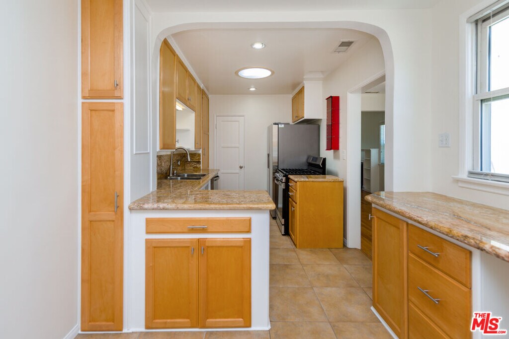 Bright, freshly refurbished home for lease on a quiet street in Kentwood section of Westchester. The property is a seamless blend of original architecture with more modern amenities, including new stainless-steel refrigerator, stove/range, dishwasher, garbage disposal and new washer & dryer. New/newer faucets throughout the house. Kitchen features granite counter tops and ample cabinet storage. Well-maintained hardwood floors plus a newly refurbished wood burning fireplace. Primary bedroom features private bath, walk-in and sliding door closets, built-in display case and sliding glass door opening to the covered patio. Attic is accessible with clean storage areas. AT&T fiber optic currently in use, also believed to be wired for Spectrum. Serene, nicely landscaped yards including mature shade and fruit trees with automatic irrigation and recently redone pathways. Landscaping maintenance by the long-term gardener included. Covered patio with dimmable lighting, and a large table w/benches. A newer steel frame gate separates 2 car driveway parking in front plus driveway space behind for additional vehicles/storage. A natural gas BBQ under a shade structure is available. 1 or 2 pets welcome, there is a dog door from kitchen to yard. MLS# 25577593