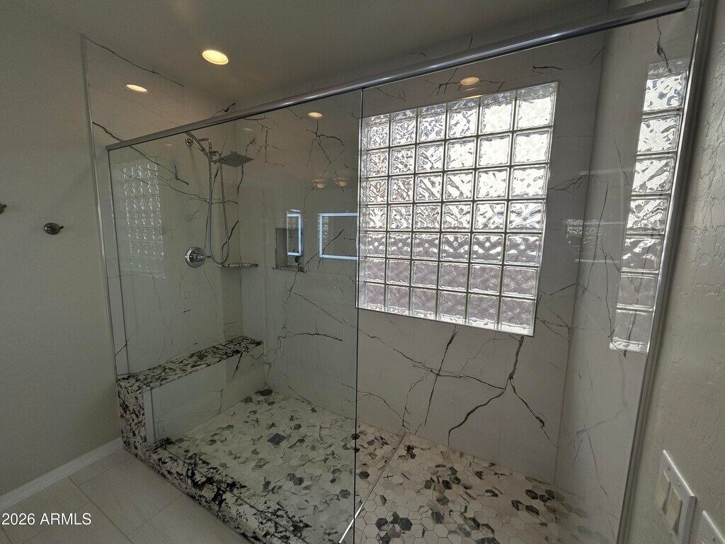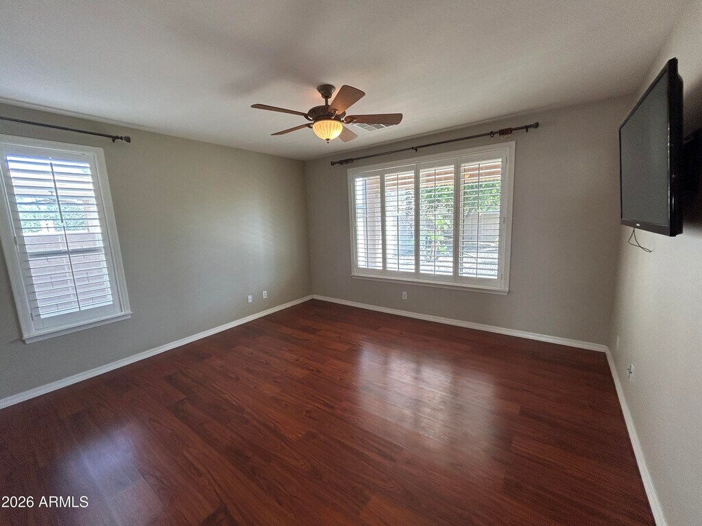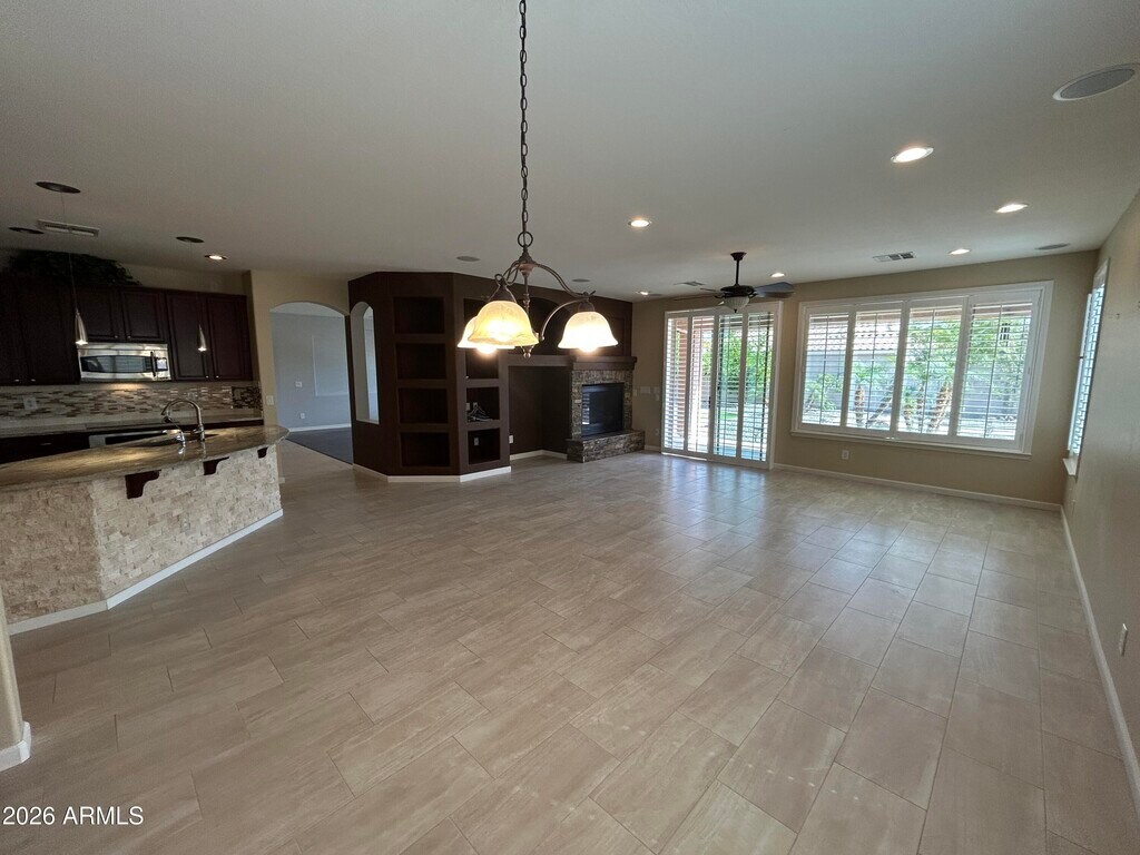 Welcome to this fantastic 3 bedroom,2.5 bathroom home (plus den AND flex space),SOLAR HOME (low electric bills) located in The Preserve at Boulder Mountain ready for early March move-in. This house features upgraded tile and wood flooring throughout,quartz/granite countertops in the kitchen and bathrooms (dual sinks),upgraded kitchen cabinetry with tile backsplash,and upgraded stainless steel kitchen appliances. Enjoy the convenience of plantation shutters throughout,remodeled walk-in showers in both the primary and guest bathrooms,and a walk-in closet in the primary bedroom. The den with built-in shelving offers additional space for comfort,along with additional cabinets in the nook area. Built-in speakers in the family room and living room,ceiling fans,and a fireplace in the family room add to the charm of this home. Step outside to the extended covered patio and enjoy the low maintenance landscaping. Located in a cul-de-sac within walking distance to a park and children's playground,this home is perfect for those looking for both comfort and convenience.