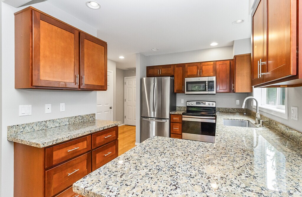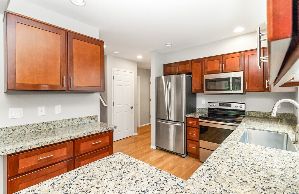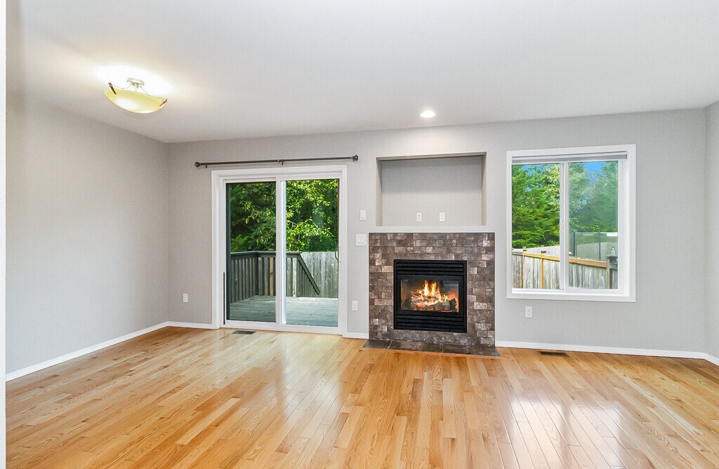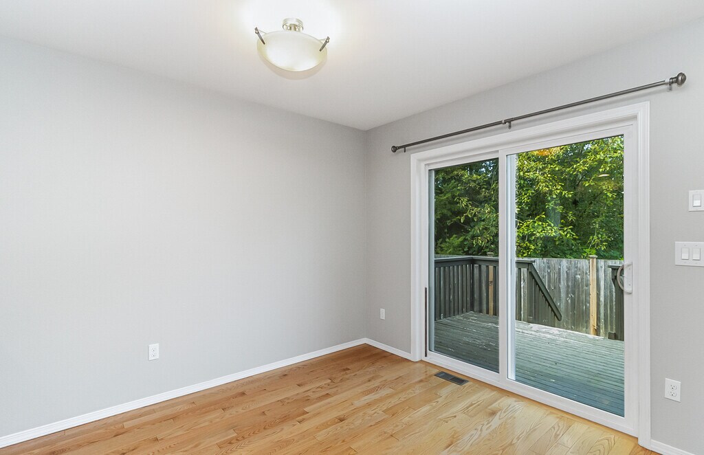 Stunning Home with high-end finishes! One side of a duplex: Updated and meticulously maintained 3 bed, 2.5 bath home with fenced in yard. Spacious Kitchen has stainless steel appliances, gorgeous cabinets and granite countertops. Dining area has slider that leads to the deck. Living room has a gas fireplace with beautiful tiled surround. Bright hardwood floors throughout lower level. This home has an abundant amount of natural light. The huge master bedroom has vaulted ceilings, an attached 5-piece bath and large walk-in closet. Laundry upstairs, 2 car attached garage with plenty of storage. No Pets No Smoking. Move in November 15, 2025