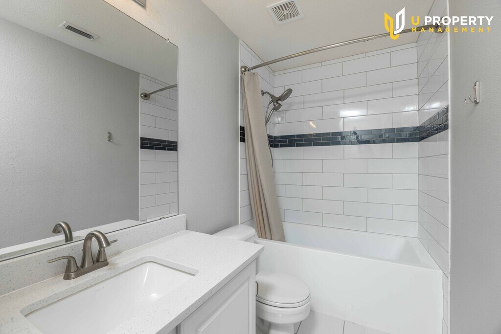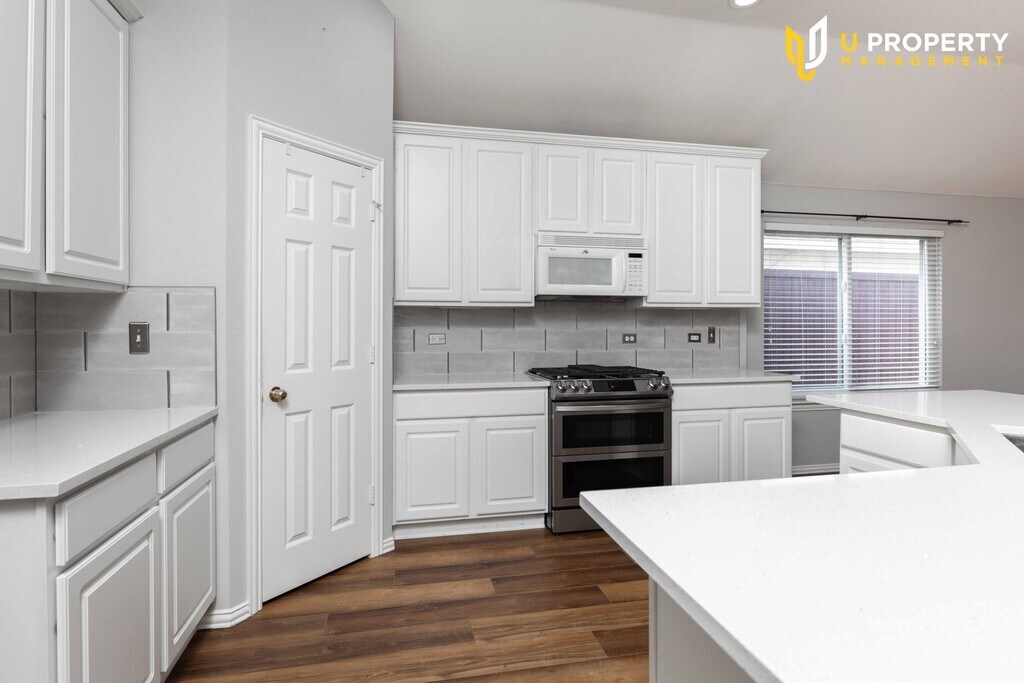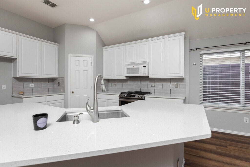 This move-in ready home in a prime location bordering Frisco and Little Elm features a bright open-concept layout with luxury vinyl flooring, updated carpeted bedrooms, and fully remodeled bathrooms. The modern kitchen boasts white quartz countertops, a large island, sleek gray backsplash, white cabinetry with under-cabinet lighting, a Samsung gas range with a new gas line, and an LG dishwasher (2021). Step outside to an extended patio with pergola—perfect for relaxing or entertaining. Located next to the Legends Hiking & Biking Trail, with easy access to parks, shopping, dining, and major commuter routes. Move-in ready, upgraded, and ideal for families!