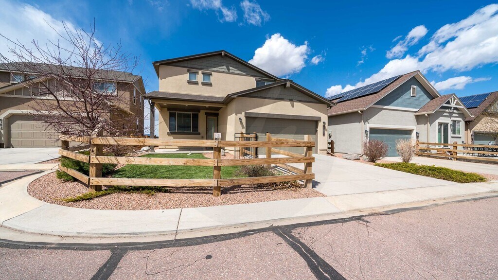 Immaculate two story stucco home located in the Renaissance at Indigo Ranch neighborhood. This home greets you with gleaming hardwood flooring and loads of natural light. Living room with gas fireplace flows into dining room and kitchen. Kitchen has stainless steel appliances, gas range, a large center island and a custom walk in pantry. Main floor rounds out with half bathroom and two car attached garage. Spacious primary bedroom with ensuite bathroom has oversized walk in shower, double vanity and walk in closet. Upper floor provides two additional bedrooms, full bathroom and laundry room. Neutral colors and modern accents throughout home. Enjoy the xeriscaped yard for easy maintenance and covered front and back patios. Amazing view of Pike Peak from your front porch. Close to schools, parks and all your shopping needs along the Powers Corridor. For more information go to