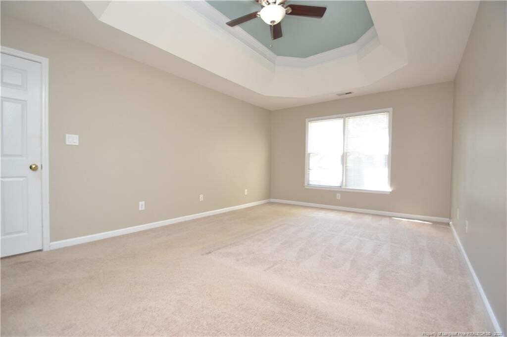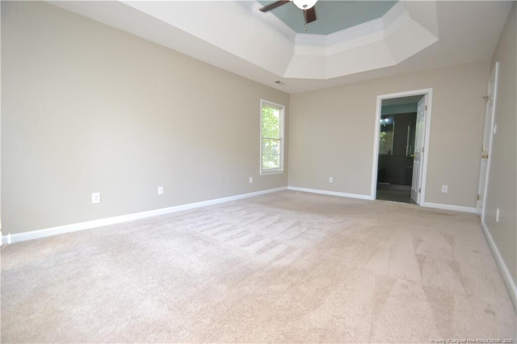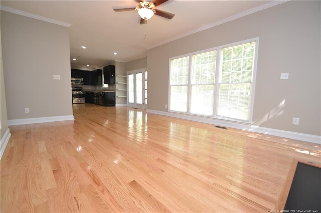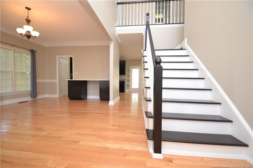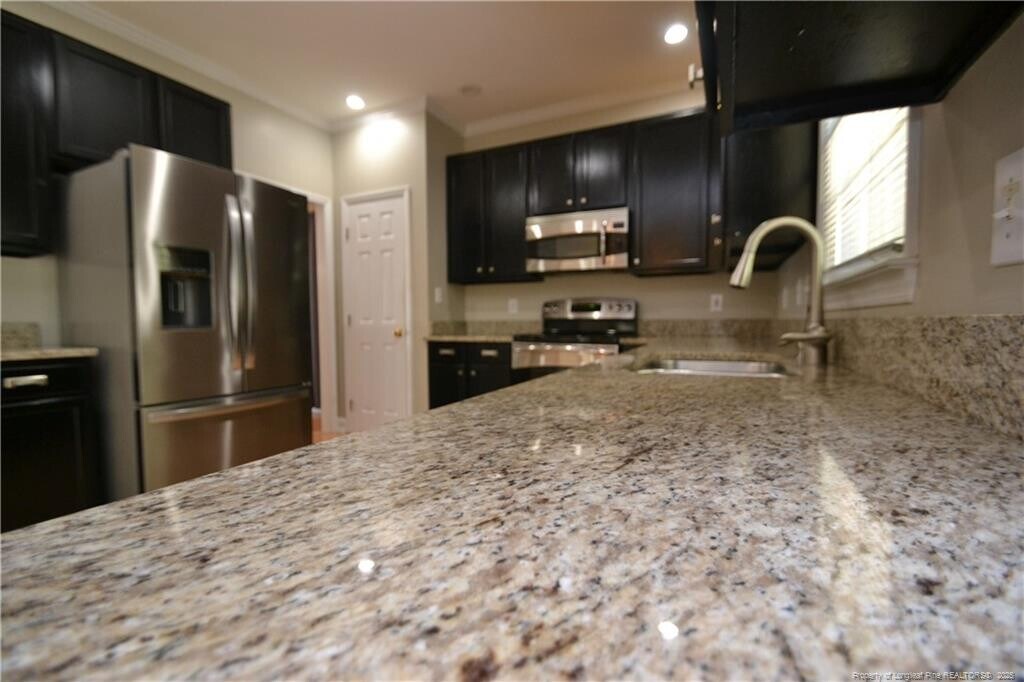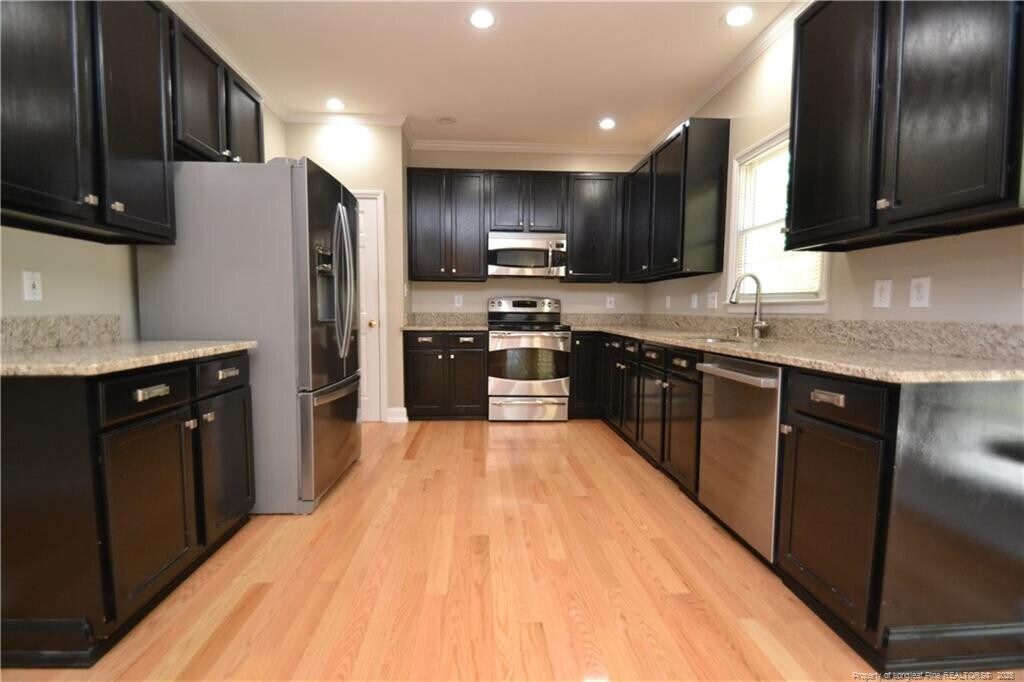 This fantastic home is available for immediate occupancy and sure to please! 6524 Englehardt Drive is tucked-away in Dominion Park; a coveted north Raleigh neighborhood convenient to RTP, I-540, local, highly-rated schools, parks and more. A wide driveway, alluring curb appeal and a beautiful palm tree greet you on arrival. Once inside, you'll find yourself in a dramatic, 2 story foyer with copious amounts of natural light, gorgeous hardwood flooring and an exposed staircase. The foyer opens on the left to a large dining room with 4 picture windows, heavy crown molding and a built-in side table that works perfectly for entertaining. Take the foyer straight ahead and you'll enter an expansive, open-concept living area that works perfectly for entertaining and casual, everyday living alike. The stunning kitchen has been totally updated with espresso cabinetry, beautiful granite countertops with an integrated backsplash, crown molding, a stainless-steel double-bowl undermount sink with a window above it, a pantry and a suite of sleek stainless-steel appliances, including a smooth-top oven, a built-in microwave and a French door refrigerator with ice and water in the door. The kitchen adjoins a perfectly-proportioned breakfast area with built-in shelving and multiple full length windows (as well as a door) overlooking the backyard and deck. The breakfast area seamlessly intertwines with a gorgeous family room offering hardwood floors, triple picture windows, recessed accent lighting, a ceiling fan and a cozy fireplace with a white mantle and contrasting accent wall. Next, take a quick jaunt to the top floor where you'll find all three bedrooms as well as a bonus room and a conveniently-located laundry room with washer/dryer included for resident's use. The primary bedroom is a sight to behold with a tray ceiling, triple windows, a walk-in closet. Its renovated bathroom features plank flooring, a jetted tub, a picture window, a water closet, a tiled, walk-in shower with a frameless glass surround and dual showerheads and an elevated vanity with dual sinks and a custom concrete countertop. Bedrooms #2 and #3 are both generously proportioned with lovely natural light, walk-in closets and easy access to a renovated hall bathroom with dual sinks on a granite-topped vanity (no more arguing about who brushes their teeth first), custom storage cabinetry with frosted glass features and a separate tub/shower/water closet room. The top floor continues to impress with a bonus room offering that additional space we always seem to be in need of. It also includes custom cabinetry, a built-in desk and a place for a TV. Before concluding your tour at Englehardt Drive, be sure to visit the amazing fenced-in backyard. It offers a sprawling deck, shade trees, a playset, a large open space and even a wired storage shed with an AC unit!