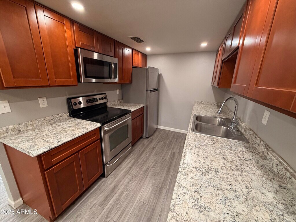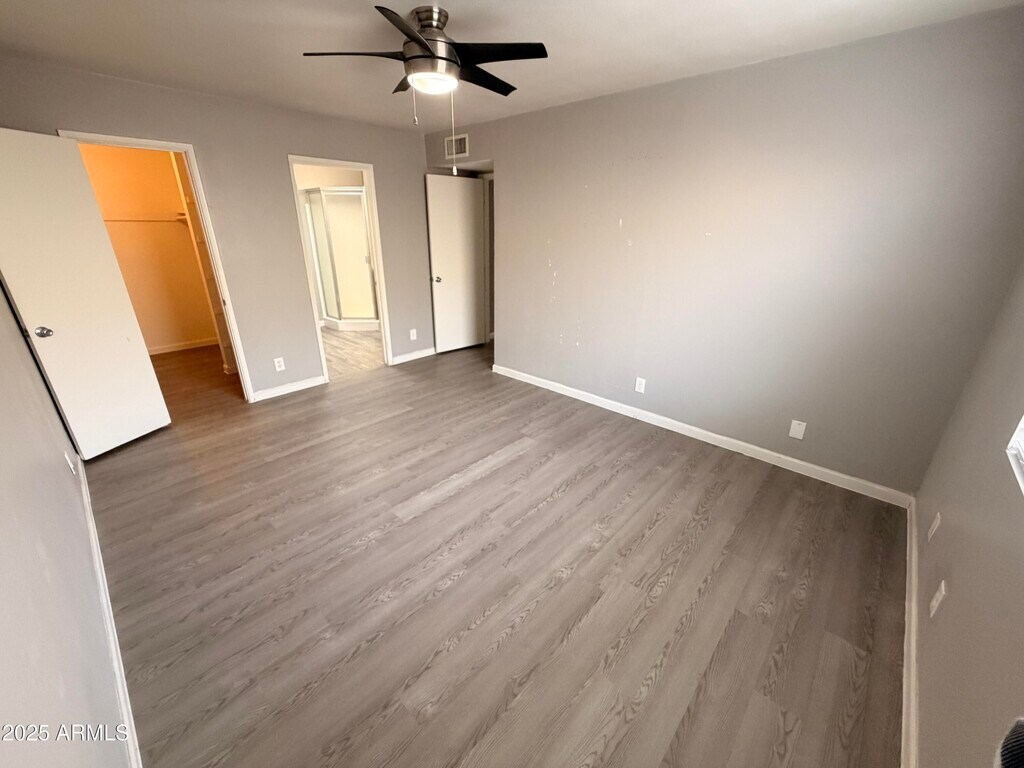 Generously sized 2 bedroom 2 bathroom unit located in Glendale with wood plank flooring and custom grey paint throughout. As you walk-in the front door,you will be greeted by a bright open concept living room and eat-in kitchen area. The kitchen has updated shaker style cabinets,double sink and full stainless steel appliance package. The primary bedroom also has an updated vanity in the private bathroom and walk-in closet. Other amenities include a dedicated laundry room with washer/dryer,carport and an enclosed patio with private yard area. This cozy community has a pool for the hot Arizona summer,a dog station and is close to the historic area of Glendale with lots of shopping and restaurants. Pet-friendly for up to two spayed/neutered pets with a $350 fee per pet.