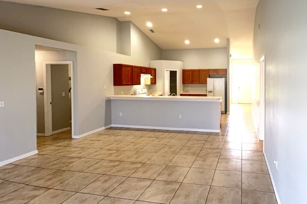 Step into this inviting and bright 3-bedroom, 2-bath home featuring a thoughtful layout and plenty of space for comfortable living. This home offers a 2-car garage, tile flooring throughout, and vaulted ceilings that add to the open, airy feel. The spacious kitchen boasts ample counter space and storage, perfectly positioned to overlook the family room—ideal for entertaining or keeping an eye on the action while cooking. Enjoy the elegance of a formal living room and formal dining room, both filled with natural light and perfect for gatherings. The large master suite features a private ensuite bathroom complete with dual sinks, a soaking tub, and a separate shower—a true retreat. Step outside to a rear patio and partially fenced yard, offering a great space for outdoor relaxation. Don’t miss the chance to own this well-appointed, move-in ready home! Just off of Poinciana Parkway and Cypress Parkway. Close to shopping and public transportation. Spacious layout is perfect for comfortable living, that you can enjoy!