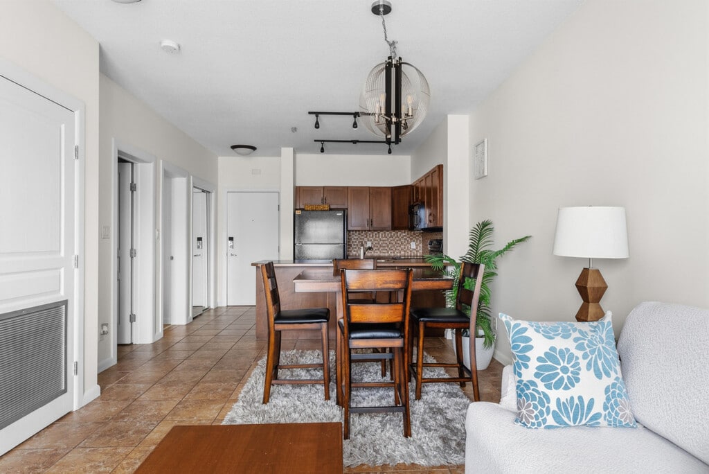 The advertised rate of C$2,035/month is the lowest available price, based on a 30 day(s) stay with a move-in date of March 20, 2026. Rates vary depending on the duration of stay, season, and other parameters. For exact pricing and additional pricing components, please visit our website and enter your desired move-in and move-out dates. The rate is applicable when billed upfront; it can be higher if billed in multiple payments. Feel at home in this bright, top-floor 2-bedroom condo in Kelowna, offering a comfortable and well-designed layout for up to four guests. The condo is in a multi-story building with elevator access. Enjoy open living and dining spaces filled with natural light. The living area features a cable TV, and the dining area has seating for four. The fully equipped kitchen includes essentials for everyday cooking. Additional amenities include a full bathroom with a shower/tub combo, in-suite laundry, ample closet storage, and a private balcony with seating and peaceful mountain views. Guests have access to a shared pool, hot tub, and steam room. Secure underground parking is included, and street parking is available. Centrally located near waterfront paths and daily essentials, this condo is within walking distance of shops, groceries, parks, and restaurants. It's also an easy walk to nearby bus routes with convenient city access. Okanagan Lake Waterfront is approximately a 5-minute drive, Gyro Beach is approximately a 3-minute drive, Downtown Kelowna is approximately a 10-minute drive, Waterfront Park is approximately a 12-minute drive, and Kelowna International Airport is approximately a 25-minute drive. Nearby dining and bar options include Momo Sushi Mission, The Fixx Café, Creekside Pub & Grill, and BNA Brewing Co. No parties, events, or large gatherings are allowed. Smoking is prohibited in the property and its vicinity. Pets are not allowed. [SI]