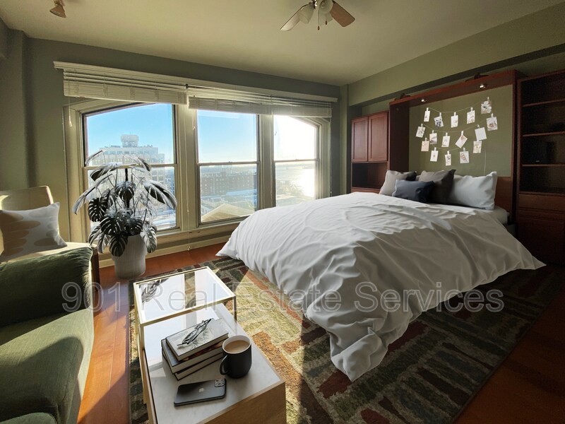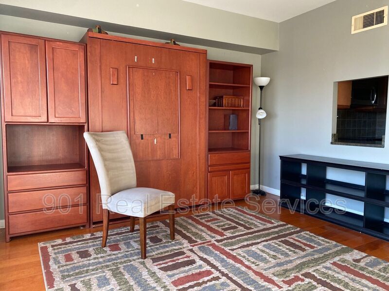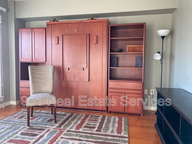 Enjoy incredible city and river views from this semi-furnished studio on the 11th floor of the Shrine Building, located in the heart of Downtown Memphis. Several stylish furniture pieces are included, while still leaving room to personalize the space and make it your own. This well-designed space features floor-to-ceiling windows that flood the unit with natural light and showcase panoramic views of the Mississippi River and skyline. A Murphy bed easily folds away to create more room for living and entertaining. The modern kitchen includes stainless steel appliances, sleek wooden cabinetry, and granite countertops. Multiple closets and shelving provide excellent storage. Washer and dryer included! 12-month lease. Sorry, no pets. The Shrine Building is a controlled access building and offers residents top-tier amenities, including an indoor pool, fitness center, and a rooftop deck with grills. While parking is not included, nearby options are available. SCHEDULE A SHOWING: Professionally managed by 901 Real Estate Services *Additional fees may apply. Please see below. Some photos may be virtually staged.* *Typical fees for approved applicants, not including security deposit: one-time admin fee of $250; one-time pet fee & monthly pet rent, determined by PetScreening per pet; any fees associated with specific communities or buildings. Advertised rent price per month includes $40 Resident Benefit Package. Please ask the Property Manager for more information.* **Avoid scams: We do not post our properties on Facebook Marketplace or Craigslist and will never ask you to pay anything through CashApp, Zelle, or Venmo.** Amenities: fitness center, granite countertops, controlled access building, furnished, floor to ceiling windows, roof top terrace, beautiful hardwood flooring, ceiling fan(s), dressing closet(s), indoor swimming pool