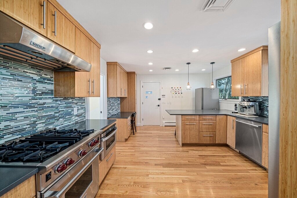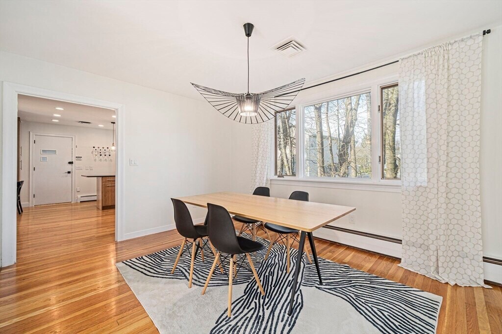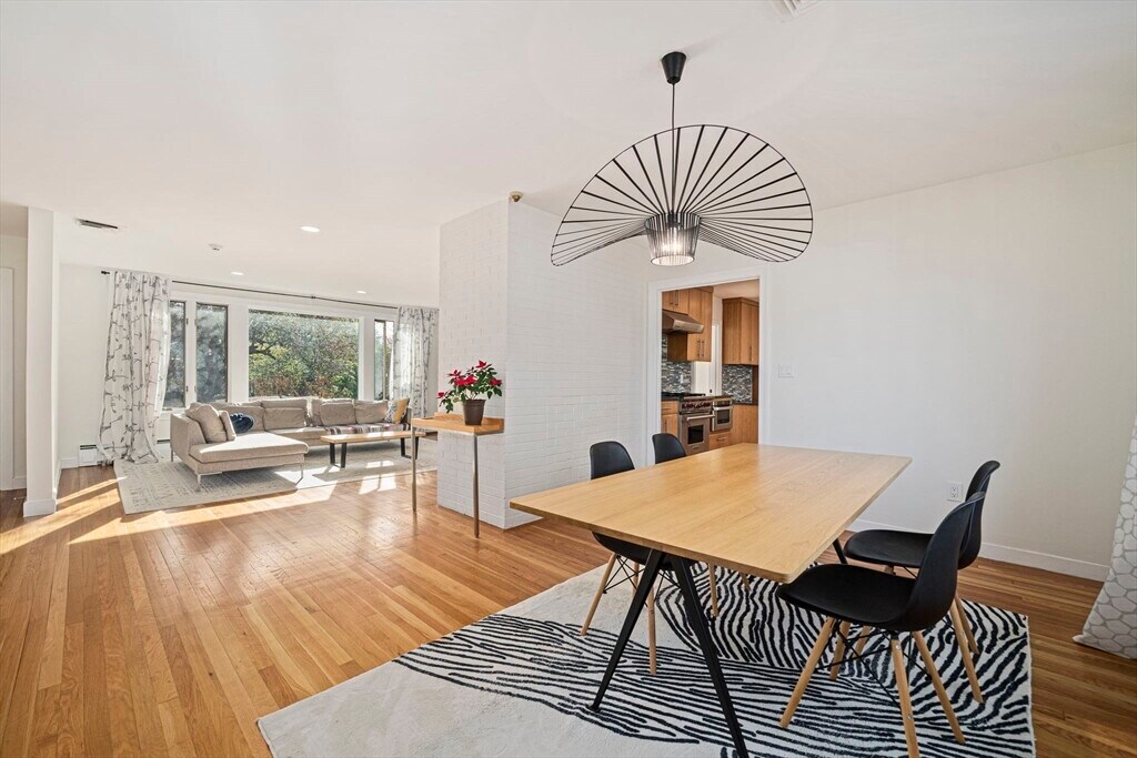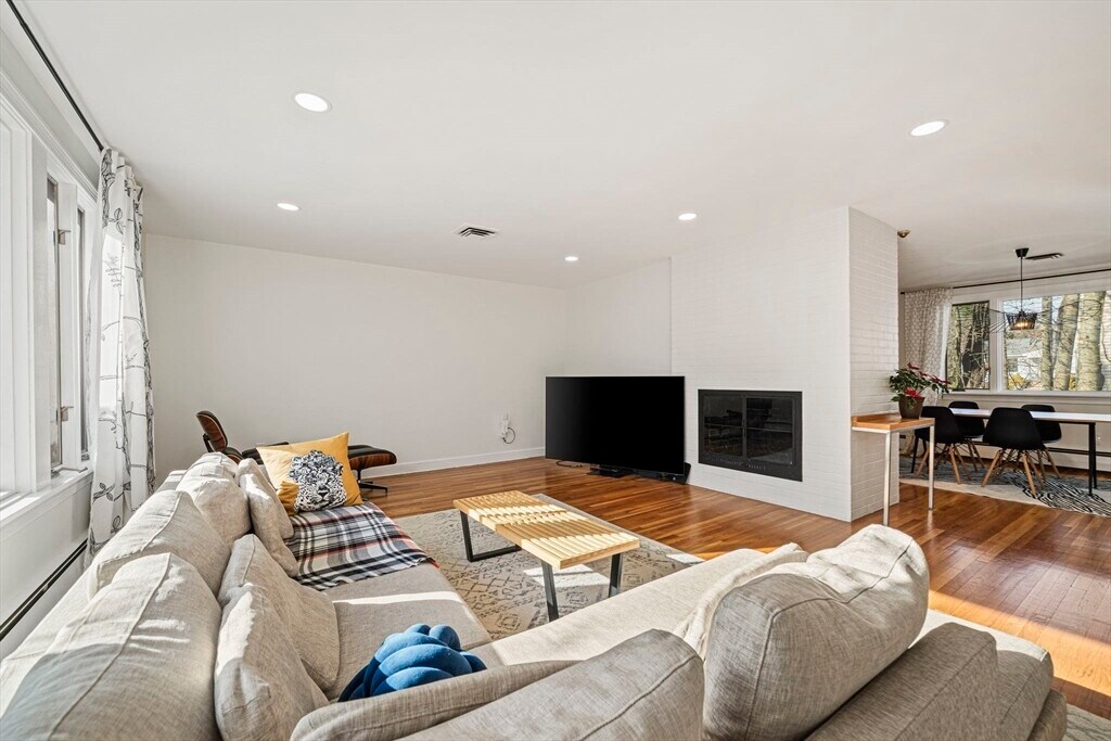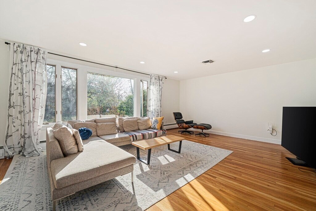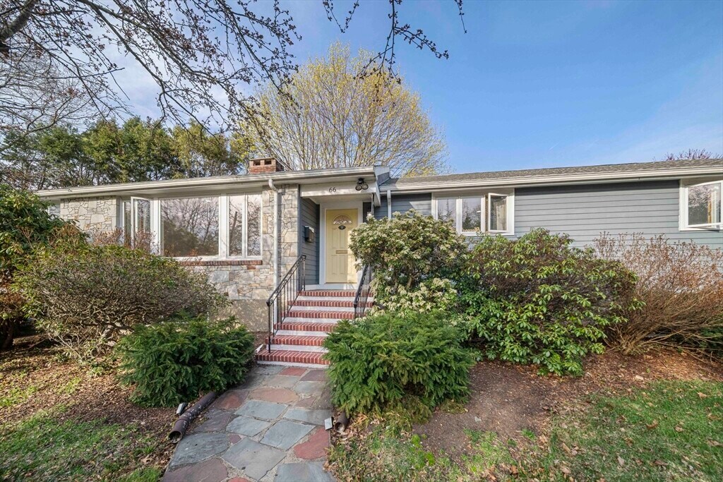 Set on a generous corner lot in one of Newton's most established neighborhoods,66 Roosevelt Road is a thoughtfully reimagined mid-century ranch within a short walk of Newton South High School. The chef's kitchen impresses with a Wolf 6-burner range,custom cabinetry,quartz countertops,glass mosaic tile backsplash,and a kitchen island with seating. The open living and dining area flows seamlessly,anchored by a fireplace and oversized windows that flood the space with natural light. Hardwood floors run throughout. The primary suite offers a renovated en-suite with frameless glass shower and floating vanity. Three additional bedrooms share an updated hall bath. A mudroom connects to the two-car garage,composite deck,fenced yard,and patio. The finished basement offers a family room,built-in bookshelves,and a half bath. In-unit washer/dryer and central A/C included. Minutes to Newton Centre,the Green Line,and top-rated Newton public schools. MLS# 73504551