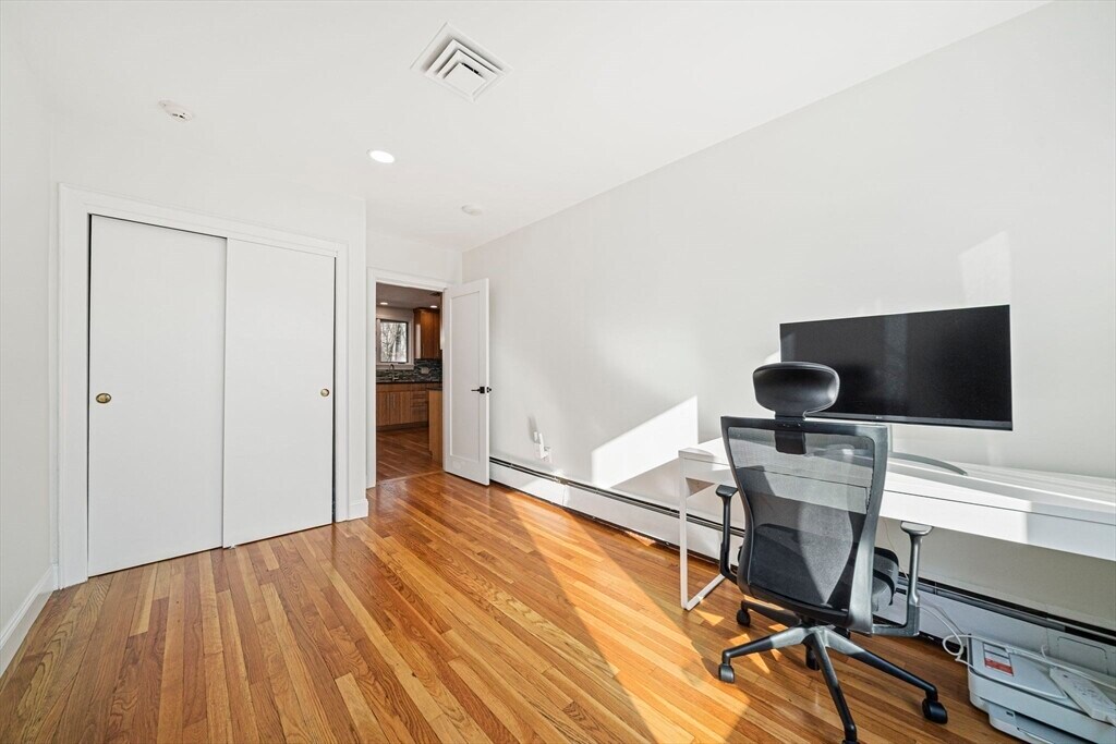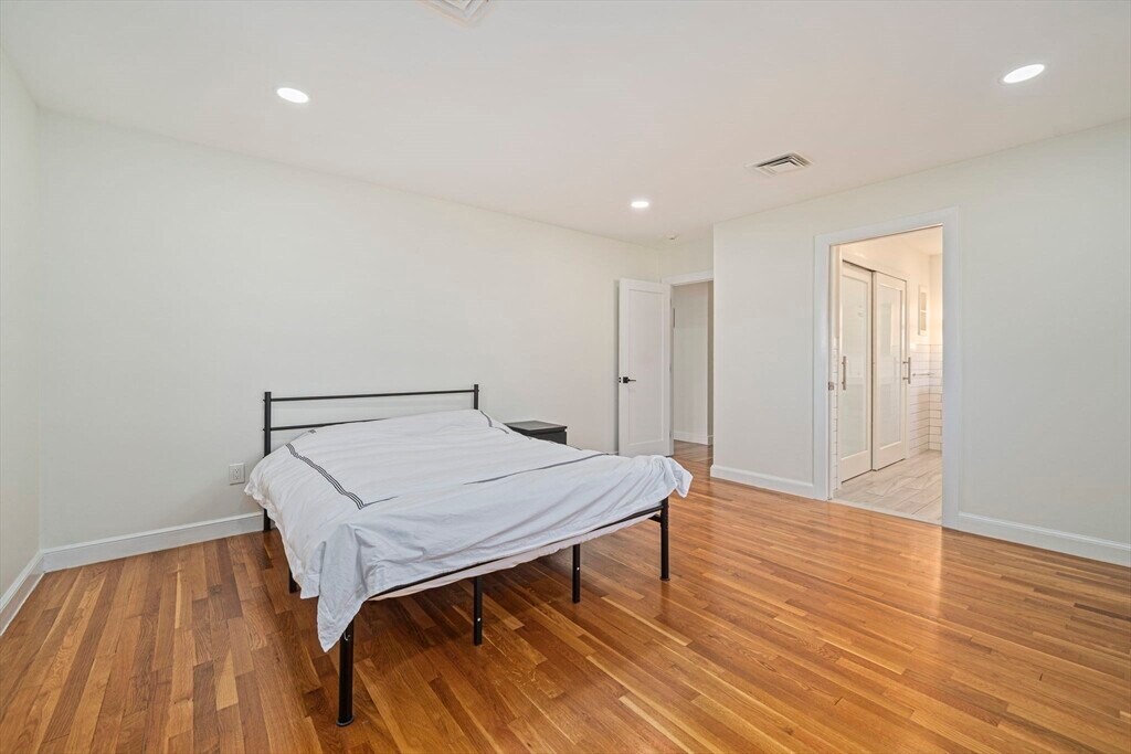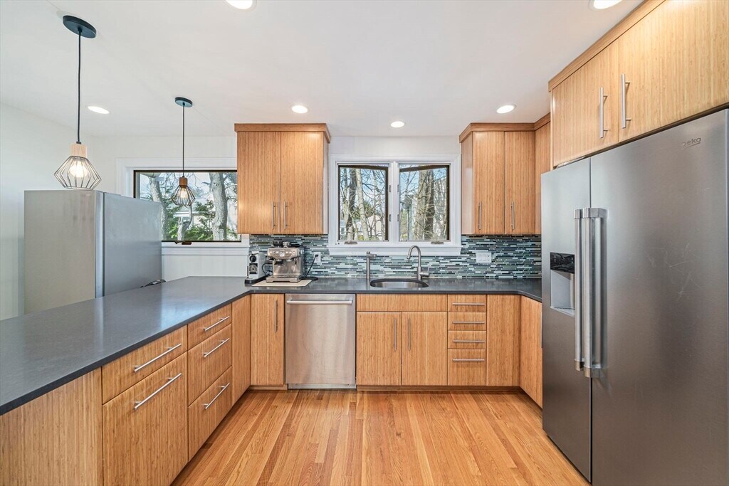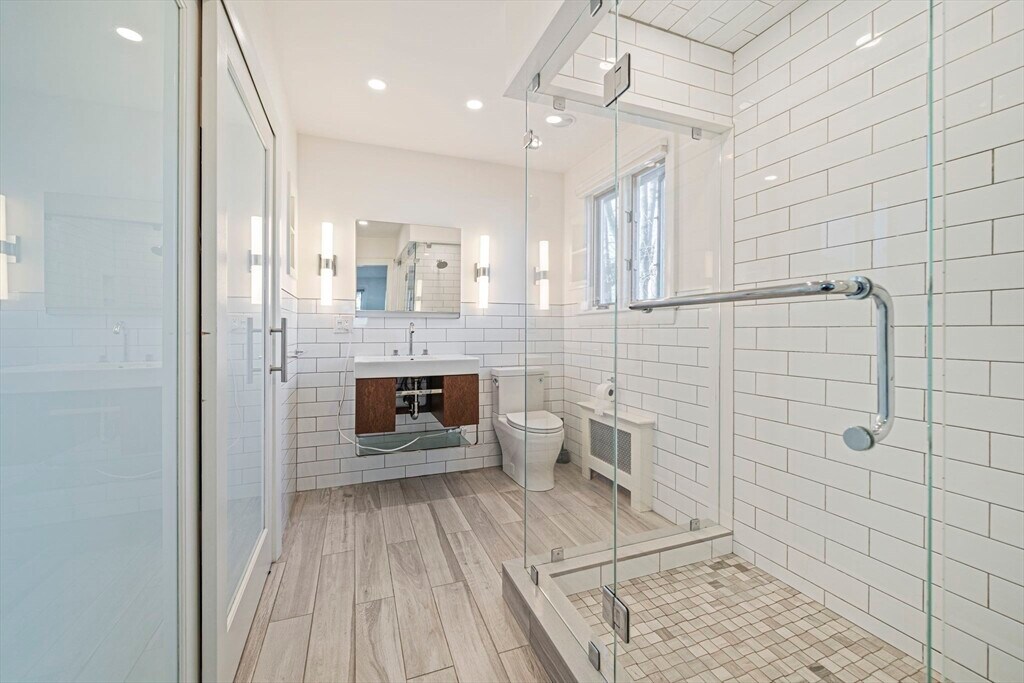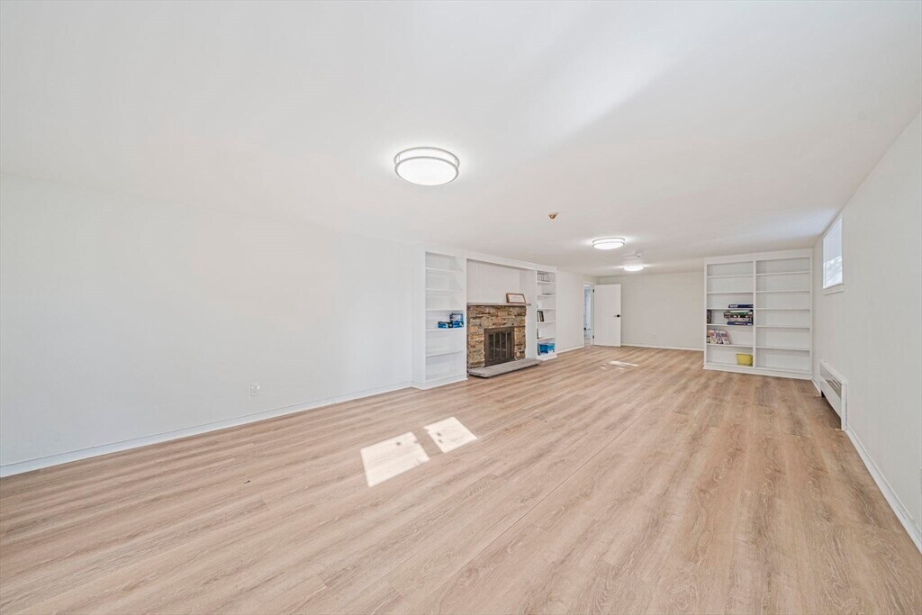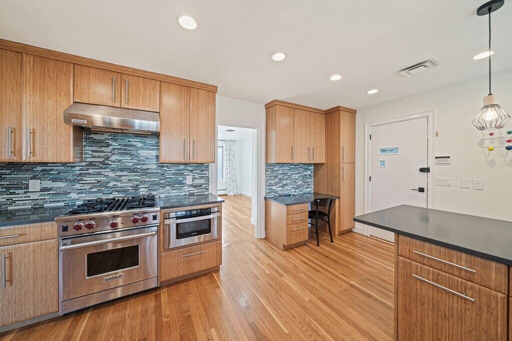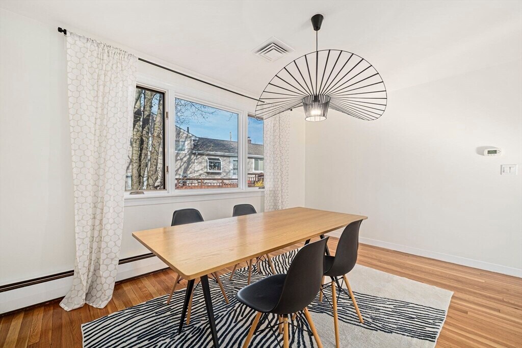 Set on a generous corner lot in one of Newton's most established neighborhoods,66 Roosevelt Road is a thoughtfully reimagined mid-century ranch within a short walk of Newton South High School. The chef's kitchen impresses with a Wolf 6-burner range,custom cabinetry,quartz countertops,glass mosaic tile backsplash,and a kitchen island with seating. The open living and dining area flows seamlessly,anchored by a fireplace and oversized windows that flood the space with natural light. Hardwood floors run throughout. The primary suite offers a renovated en-suite with frameless glass shower and floating vanity. Three additional bedrooms share an updated hall bath. A mudroom connects to the two-car garage,composite deck,fenced yard,and patio. The finished basement offers a family room,built-in bookshelves,and a half bath. In-unit washer/dryer and central A/C included. Minutes to Newton Centre,the Green Line,and top-rated Newton public schools. MLS# 73504551