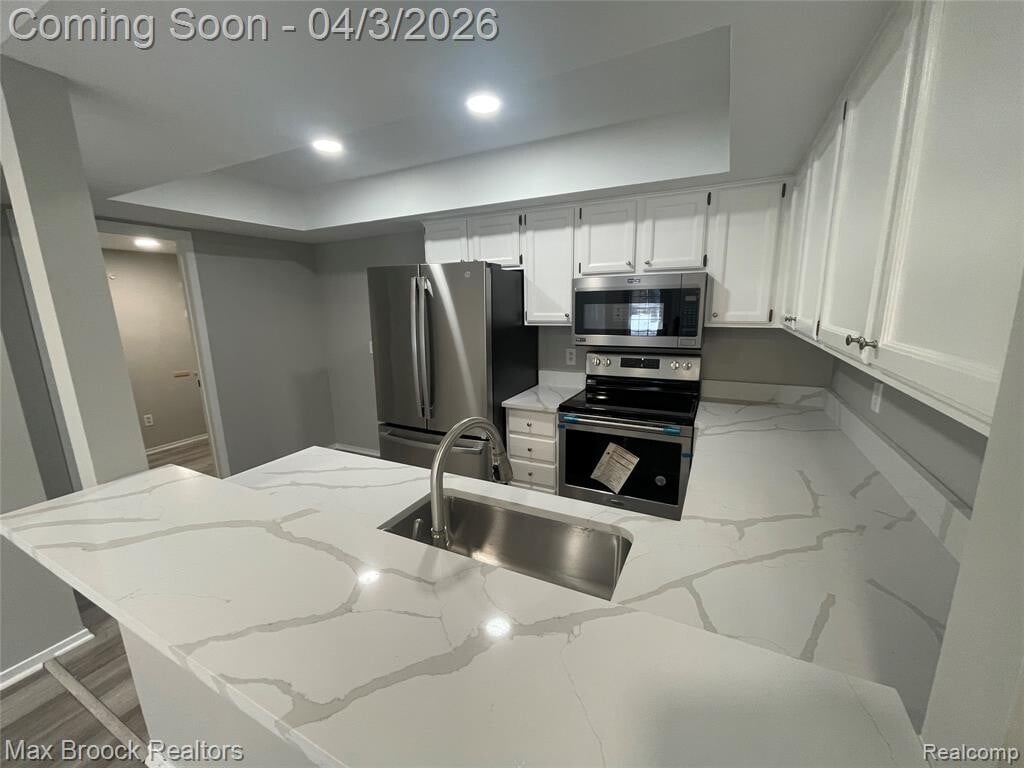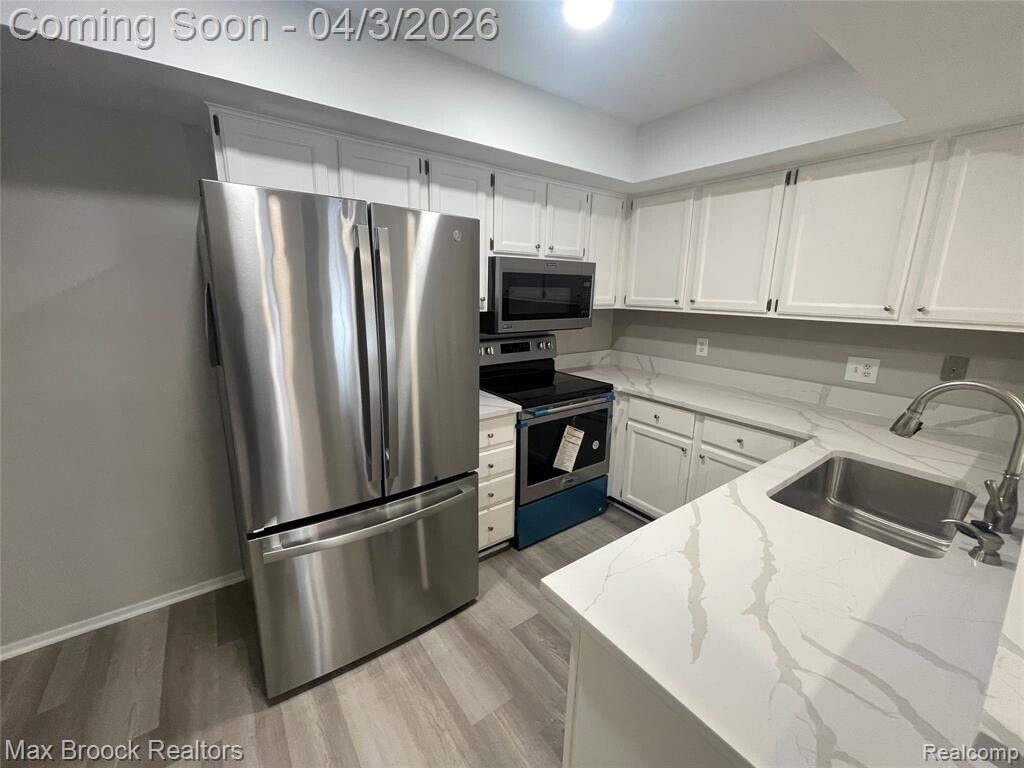 Spacious End Unit Ranch with high ceilings and skylight. This Unit is located in the highly desired Chimney Hill subdivision, in the heart of West Bloomfield. The condo features 2 bedrooms and 2 full bathrooms. Recently remodeled with a new kitchen with quarts counter tops and brand new appliances. New Luxury vinyl flooring, fresh paint throughout, recessed lighting, and new bathroom vanities. The home also sports a large living room with brick fire place and a door-wall to the fenced in private patio. The condo also has a attached 1 car garage, in-unit laundry room with washer/dryer, and a basement for extra storage. Community amenities include: Clubhouse, Outdoor Pool, and Tennis courts. Water Included in lease.