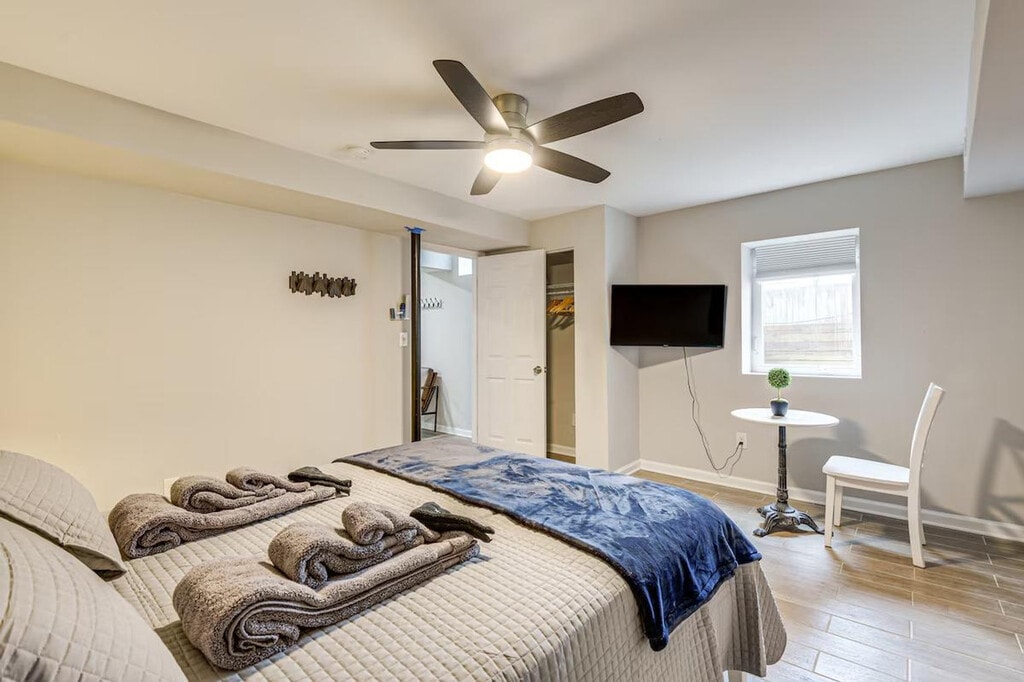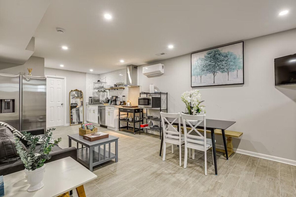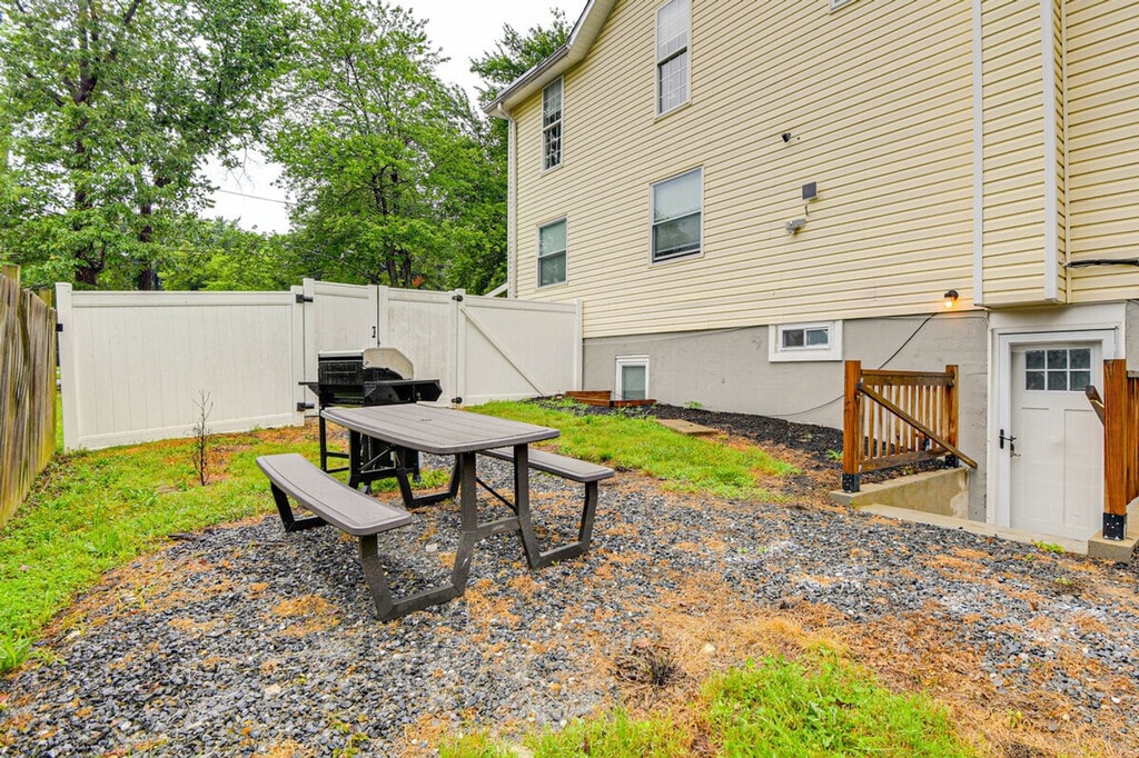 Feel at home in this cozy 2-bedroom apartment in Cheverly. This single-story apartment is located in the basement and requires exterior stairs to access. This apartment features a well-equipped kitchen with a fridge, stove, oven, dishwasher, microwave, cooking basics, toaster, and Keurig coffee maker, along with paper towels and trash bags. Enjoy the smart TV, dining table with bench seating, open floor plan, free Wi-Fi, linens, towels, central air conditioning and heating, complimentary toiletries, hair dryer, iron and board, and keyless entry. Pets are welcome with a $75 fee, with a maximum of 2 pets. Parking is available in the driveway for 2 vehicles. Enjoy an unbeatable location just 9 miles away from Washington, D.C., where you can tour the United States Capitol, visit the International Spy Museum, and see the National Mall. The apartment is also approximately 4 miles from FedEx Field. Guests can enjoy the large shared backyard and community playground. There are 3 exterior security cameras on the property: one on the front of the house facing the front entrance and driveway area, one on the side of the house facing the side yard, and one on the back of the house facing the backyard. The cameras are outward facing and do not look into interior spaces, and they record video and audio when activated by motion. Registration Number: HOU-0029-2024-STR-H [SI]
