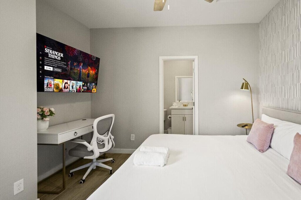 The advertised rate of $1,983/month is the lowest available price, based on a 30 day(s) stay with a move-in date of July 9, 2026. Rates vary depending on the duration of stay, season, and other parameters. For exact pricing and additional pricing components, please visit our website and enter your desired move-in and move-out dates. The rate is applicable when billed upfront; it can be higher if billed in multiple payments. Feel at home in this modern 2-bedroom, 2-bathroom apartment in Glendale, located on the 1st floor. This stylish space offers comfort and convenience. This apartment features a king-size bed, luxury Beautyrest Hybrid mattresses, and a sleek modern design. The fully stocked kitchen includes a stove, oven, fridge, microwave, dishwasher, coffee maker with coffee essentials, toaster, kettle, full dinnerware, cookware, and baking trays. The bathrooms are well equipped with a shower, bathtub, toilet, sink, mirror, towels, hairdryer, and essential toiletries. Entertainment options include a 70" 4K Smart TV in the living room, a 55" HDR Smart TV in the bedroom with the king-size bed, and two 60" HDR Smart TVs in the bedroom with the full-size beds. This apartment also includes an in-unit washer and dryer. Free on-site parking is available. This apartment is centrally located minutes from Westgate, Topgolf, shopping, dining, and close to State Farm Stadium for NFL games, concerts, and events. Enjoy quick access to major highways. Smoking is not allowed anywhere on the property—indoors, outdoors, patios, or balconies and a $500 fine applies if smoking is detected. Tampering with smoke detection devices will result in a $500 fine. Pets are not allowed on the property and bringing a pet will result in a $500 fine and may lead to reservation cancellation without refund. Parties or events are not allowed and parties will lead to police intervention, eviction without refund, and a $500 fine. Quiet hours are from 8 PM to 7 AM. A $100 fine applies for unauthorized parking. A $100 per guest fine applies for unauthorized guests. A $250 replacement fee applies for a lost access card. A $150 per hour fee applies for late checkout without approval. A $400 fine per pet applies for an unauthorized pet. [SI]